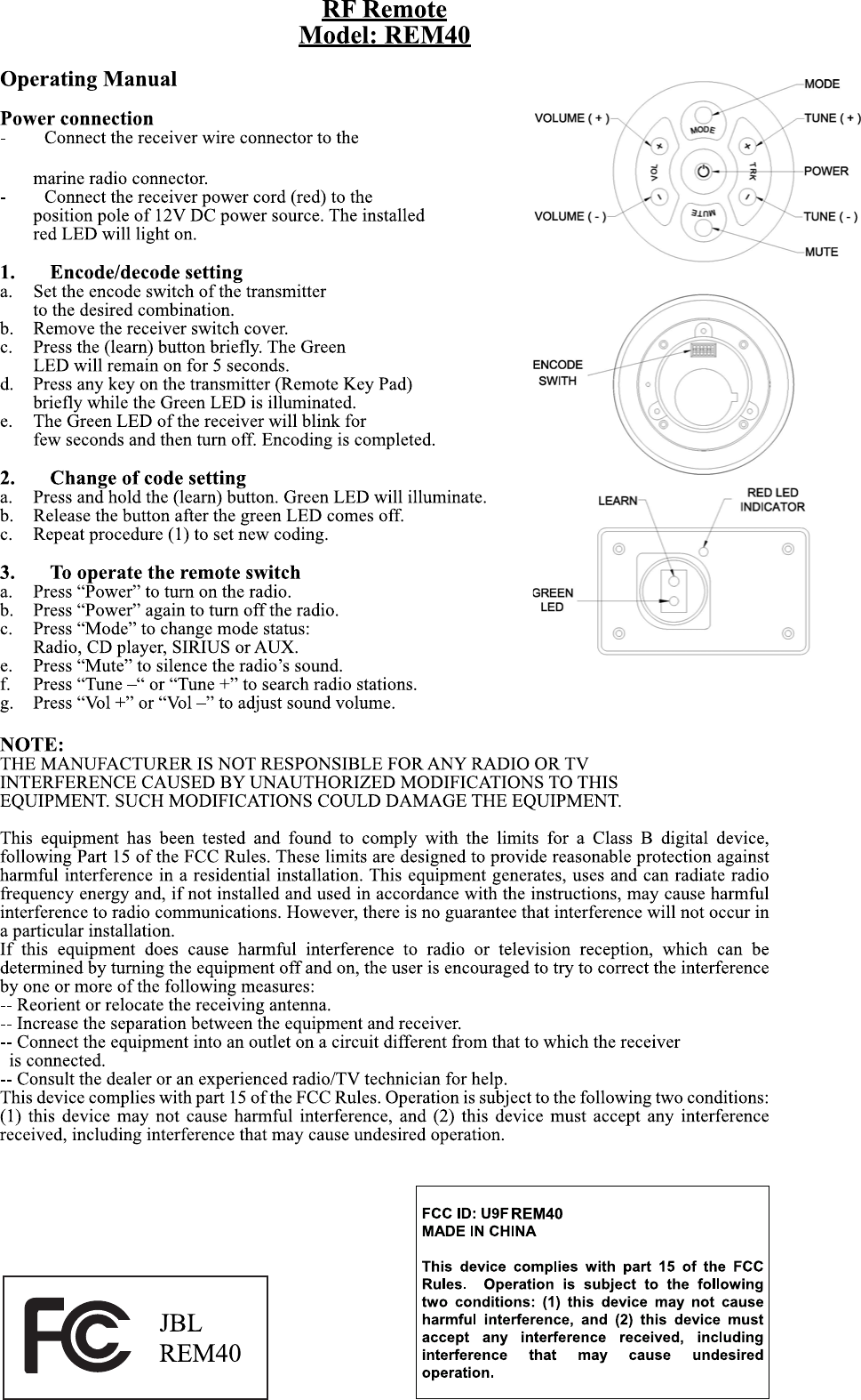 Kolf REM40 RF Remote User Manual REM40 FCCID