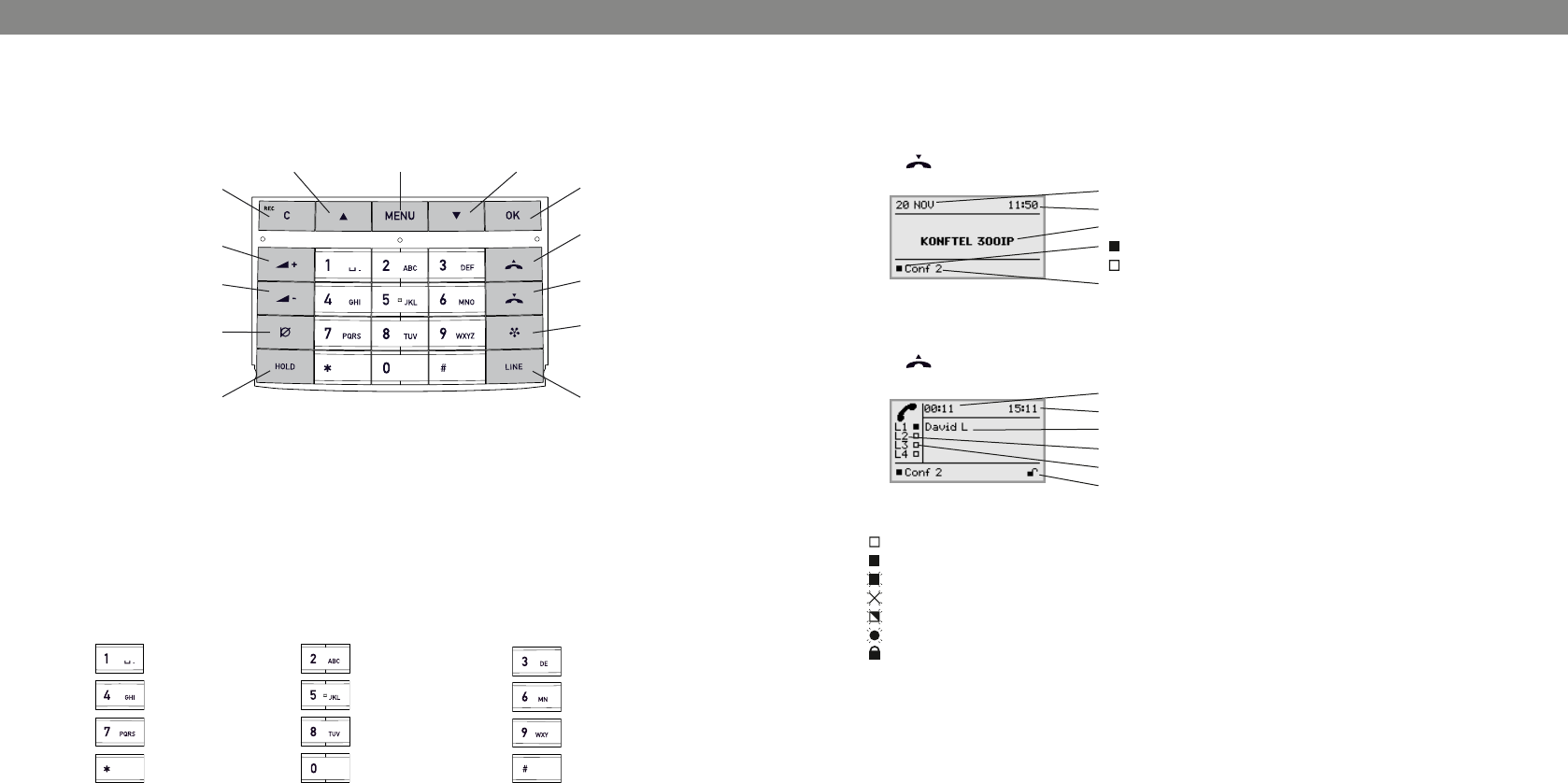 Keypad Alphanumerical 0–9, *, on, off, mute, hold, volume up,