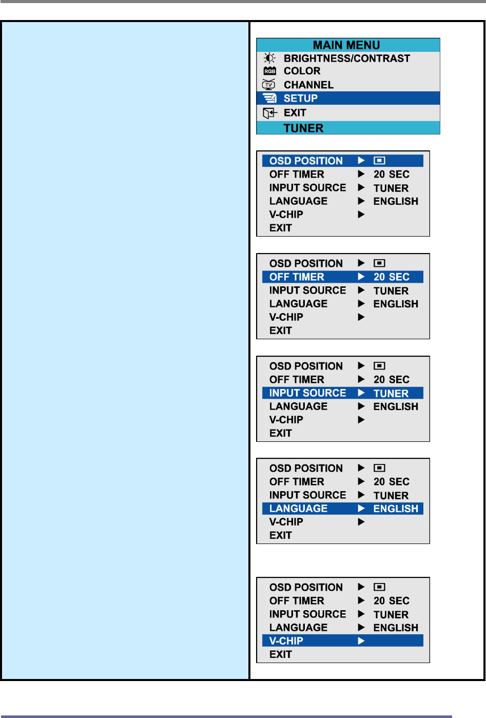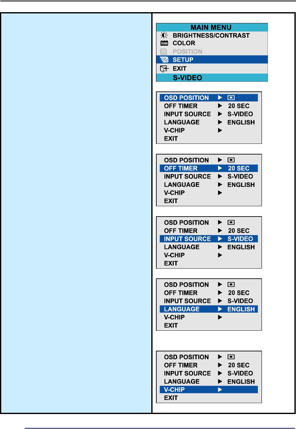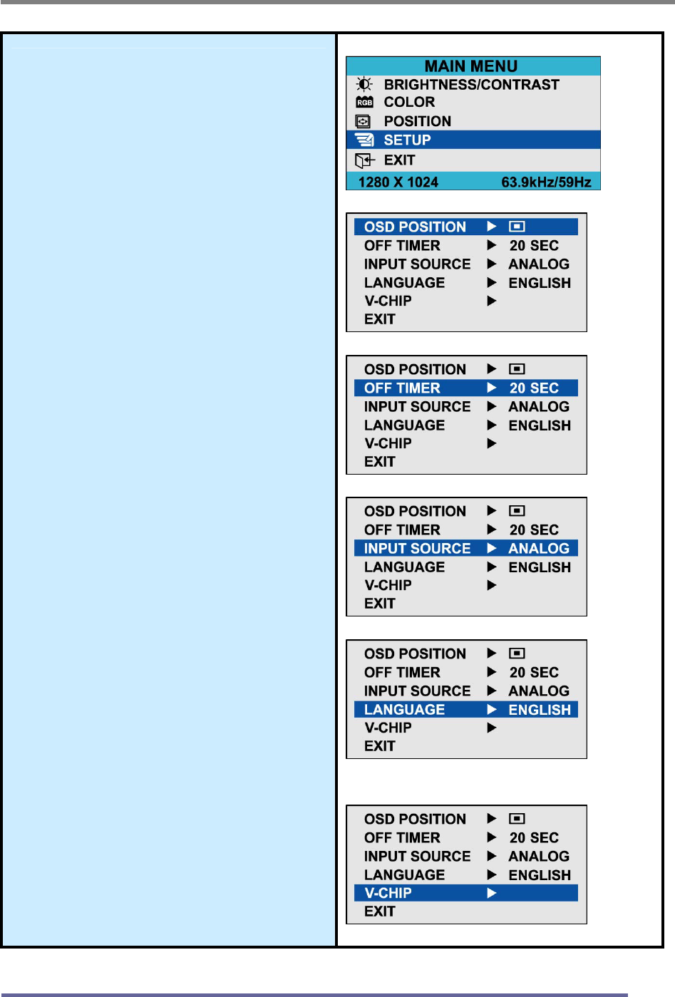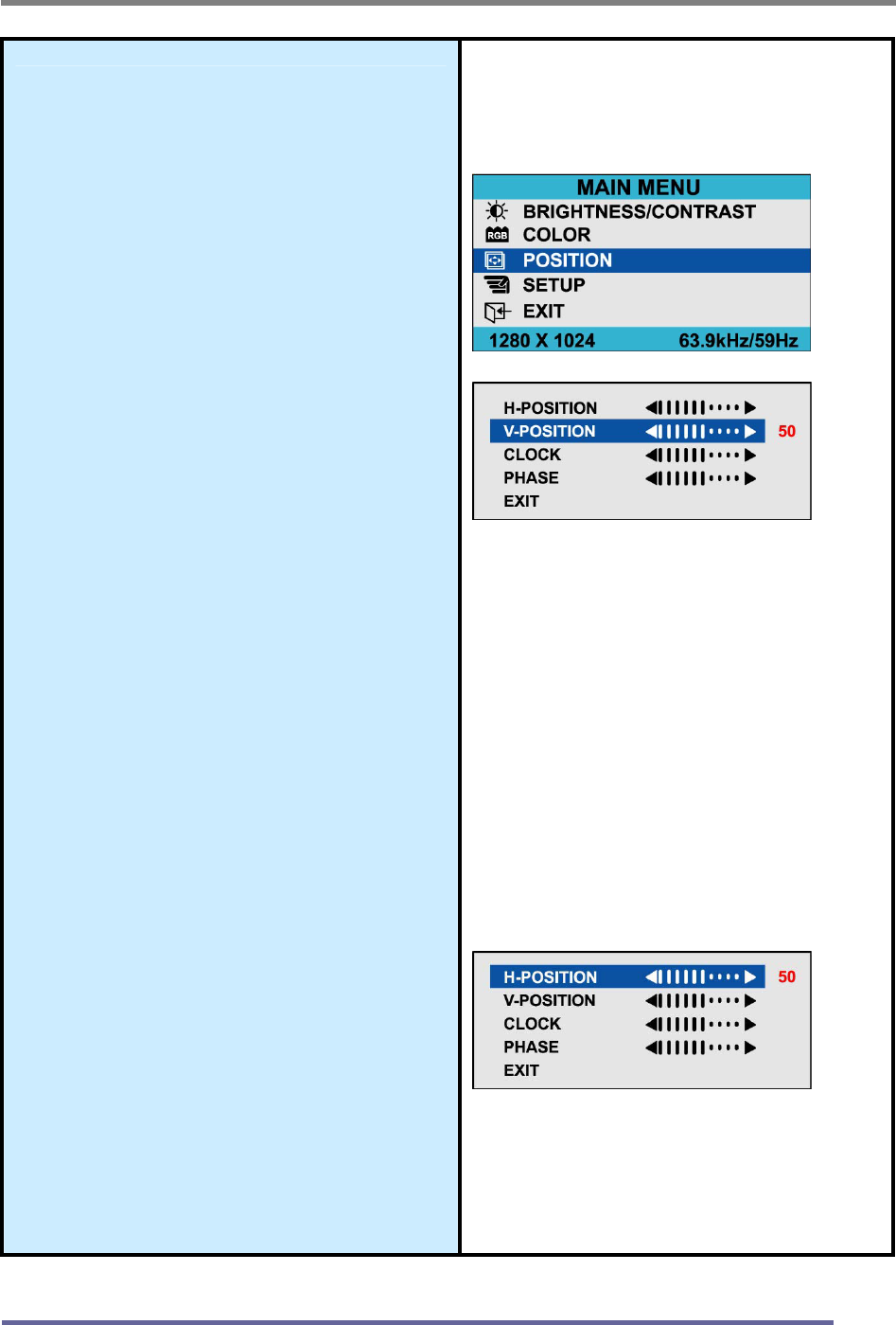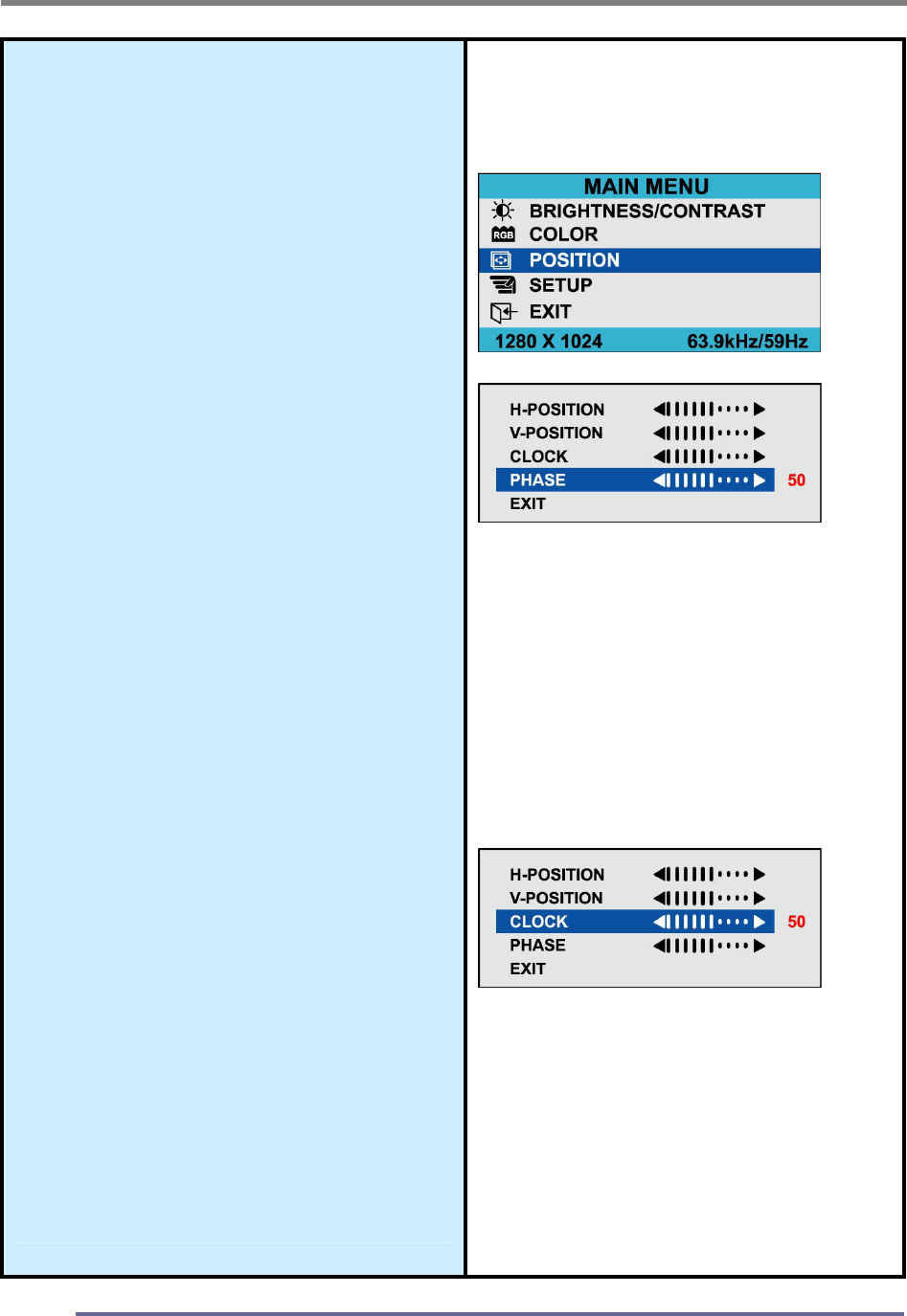 Adjustment, Clock, Phase, H/V Position, 5 OSD Languages