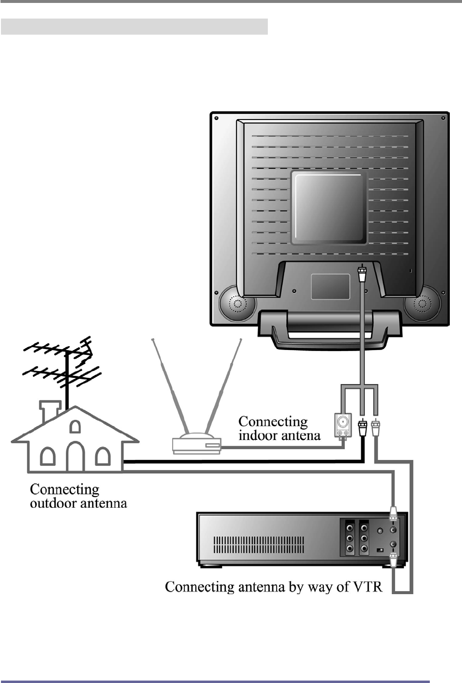 • Connect the antenna cable to the monitor directly, or via a video recorder,