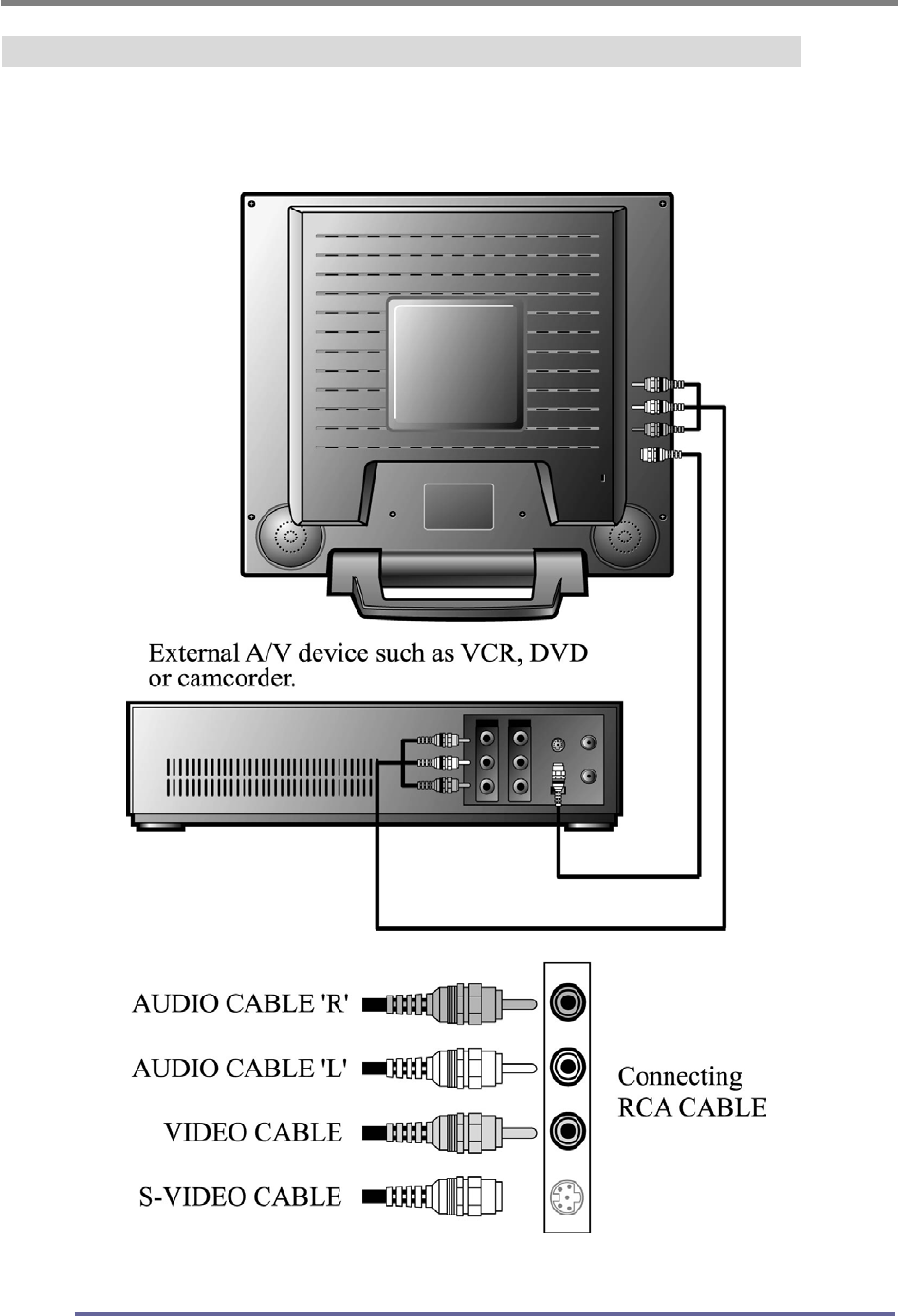 8. On the external A/V device(s), if not done already, connect the RCA Cable