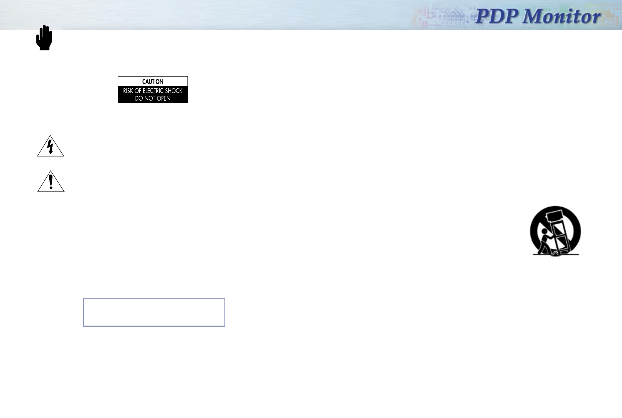 bracket, or table where it can fall. A falling PDP Monitor can cause