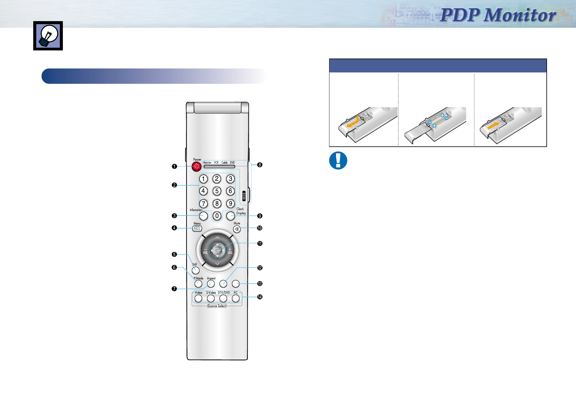 • Unplug the PDP Monitor from the wall outlet before cleaning. Use a damp cloth; do not use liquid or