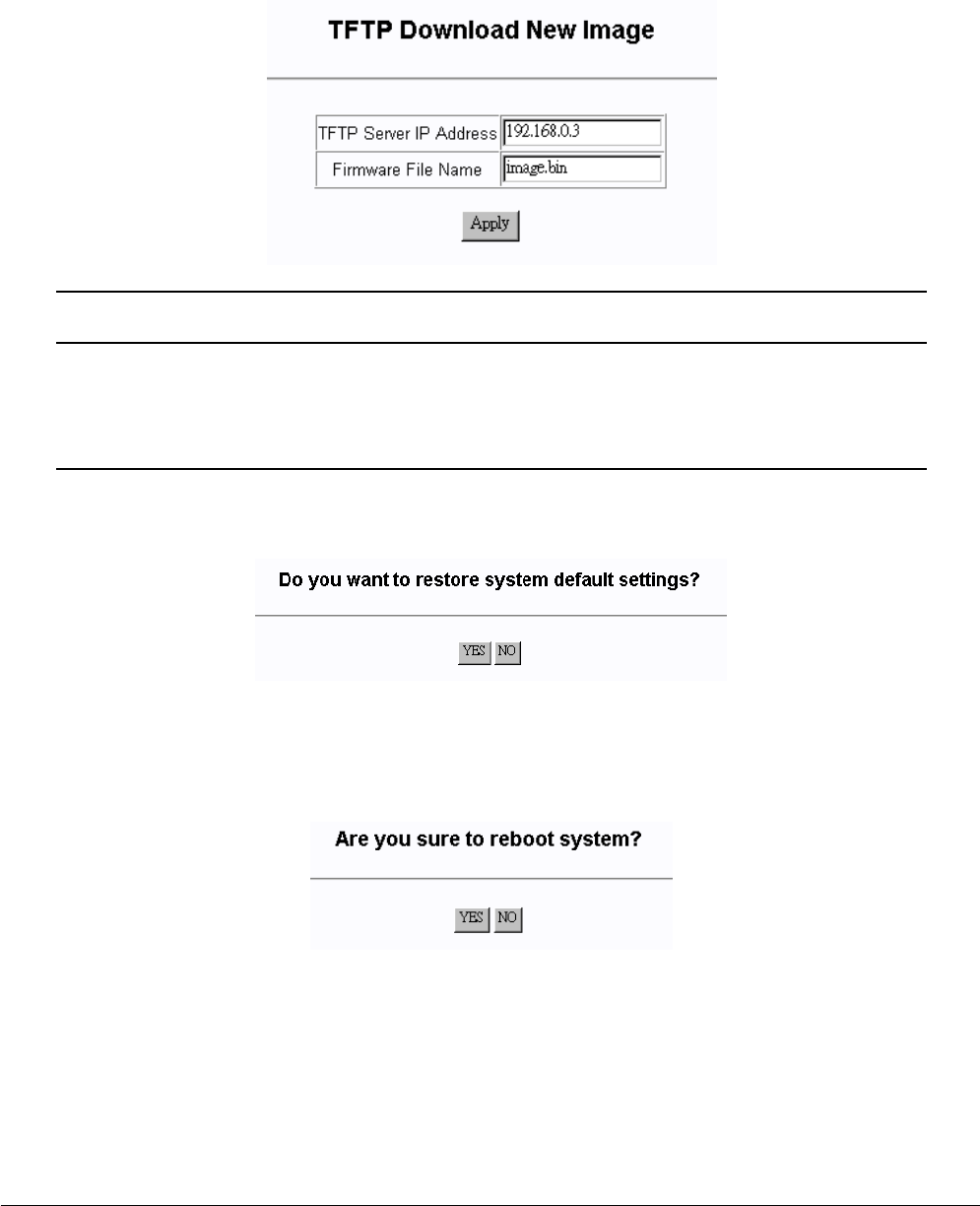 This menu is used to perform firmware (switch software) upgrade via TFTP protocol. Before doing