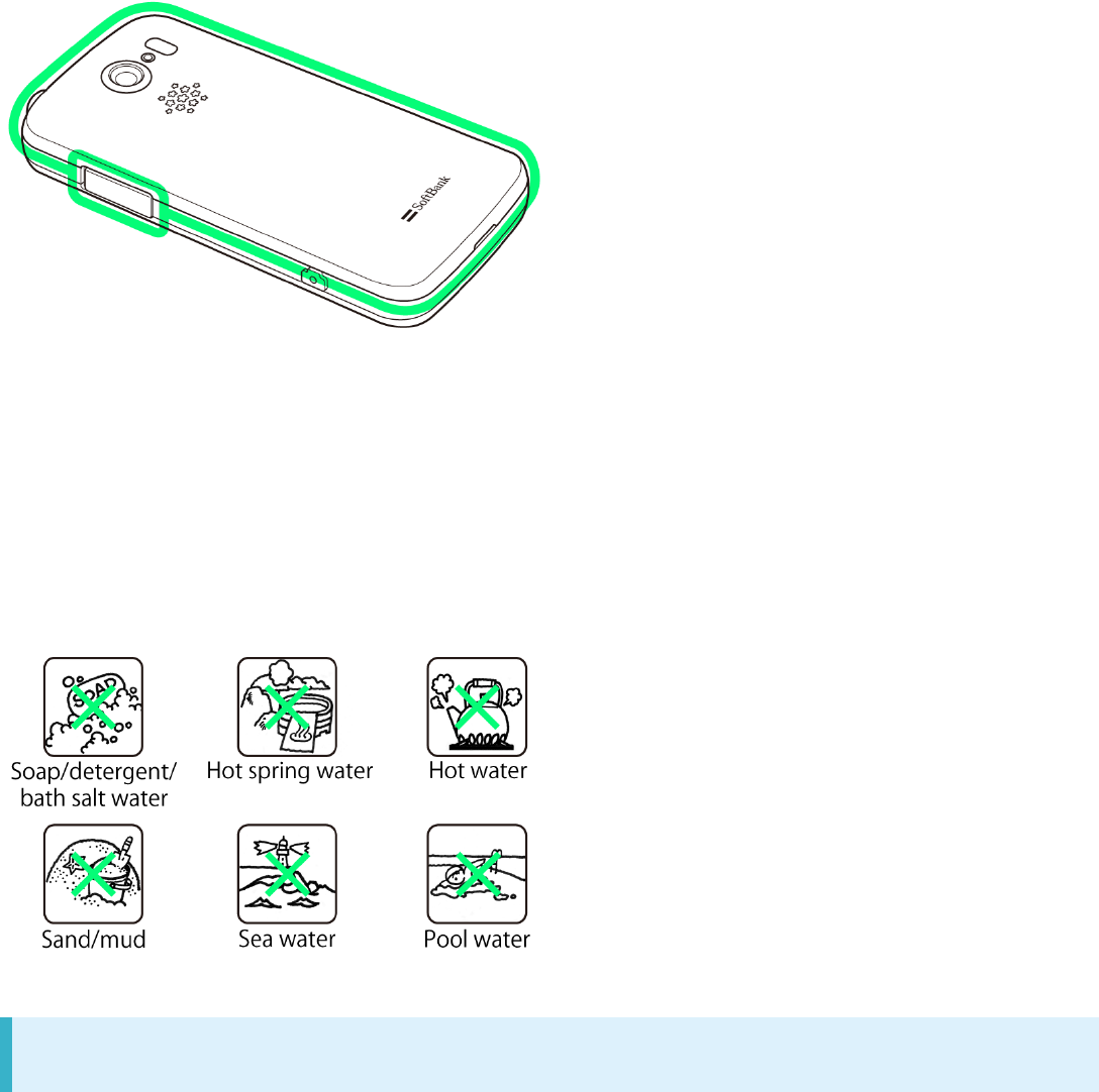 Handset accessories (AC Charger, etc.) are not waterproof.