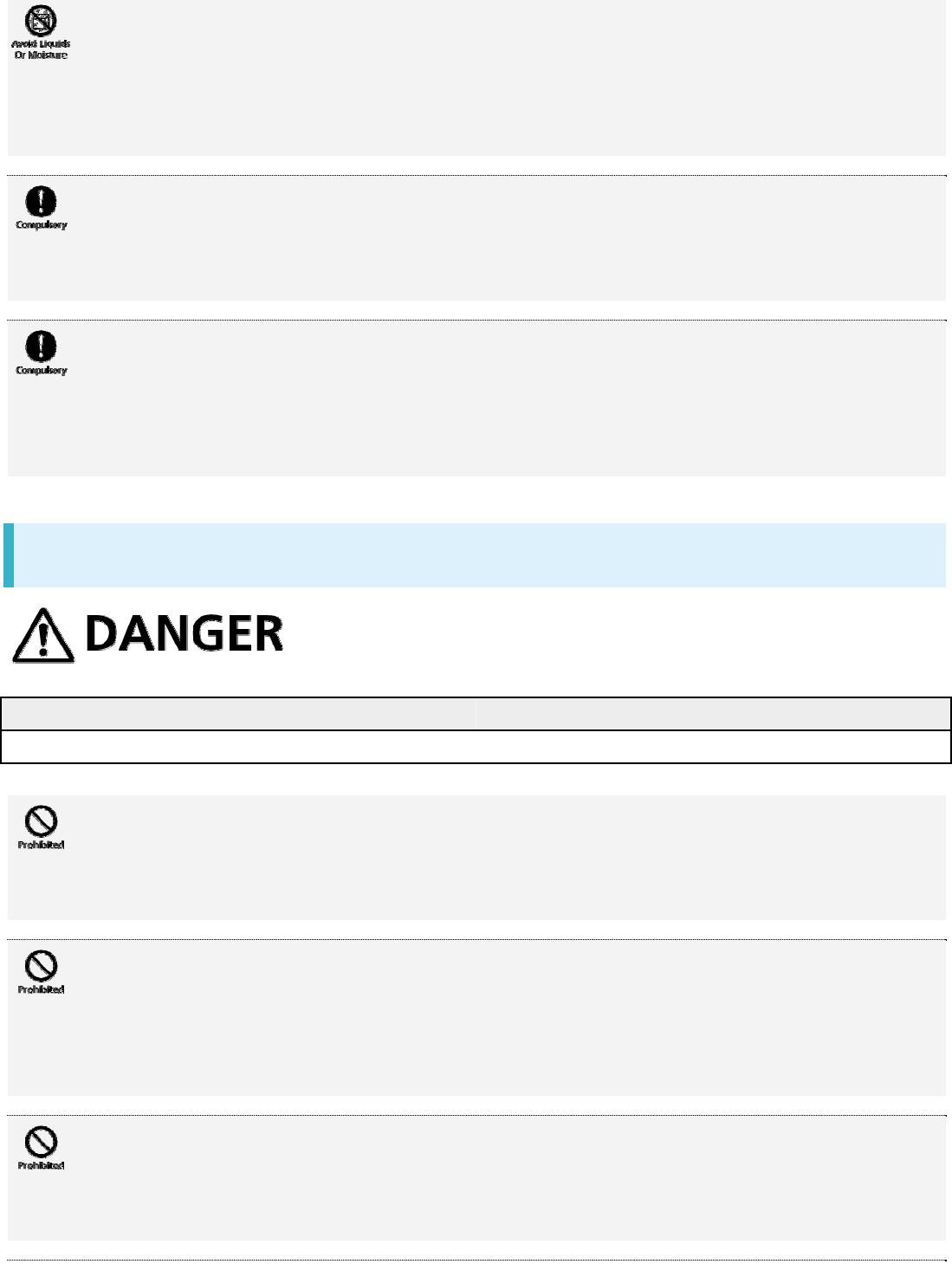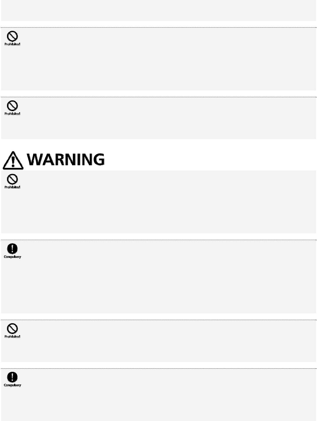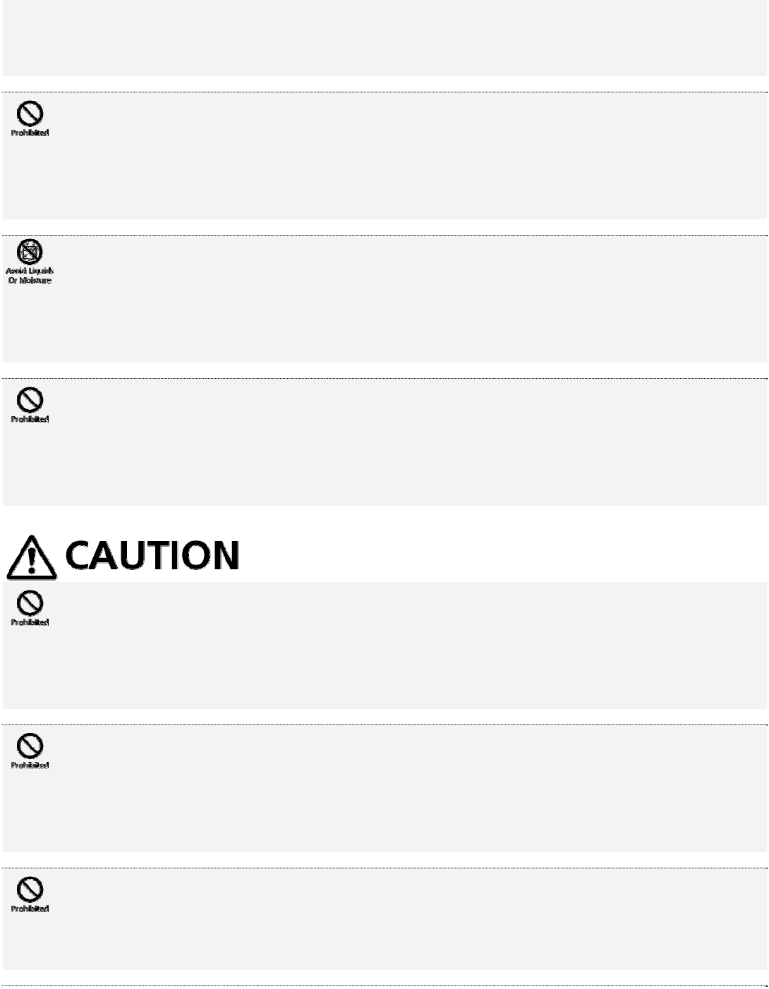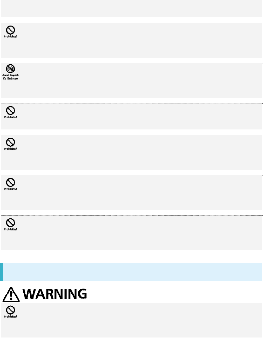May cause fire, injury, electric shock or malfunction. Also, battery may leak, overheat, rupture or ignite.
