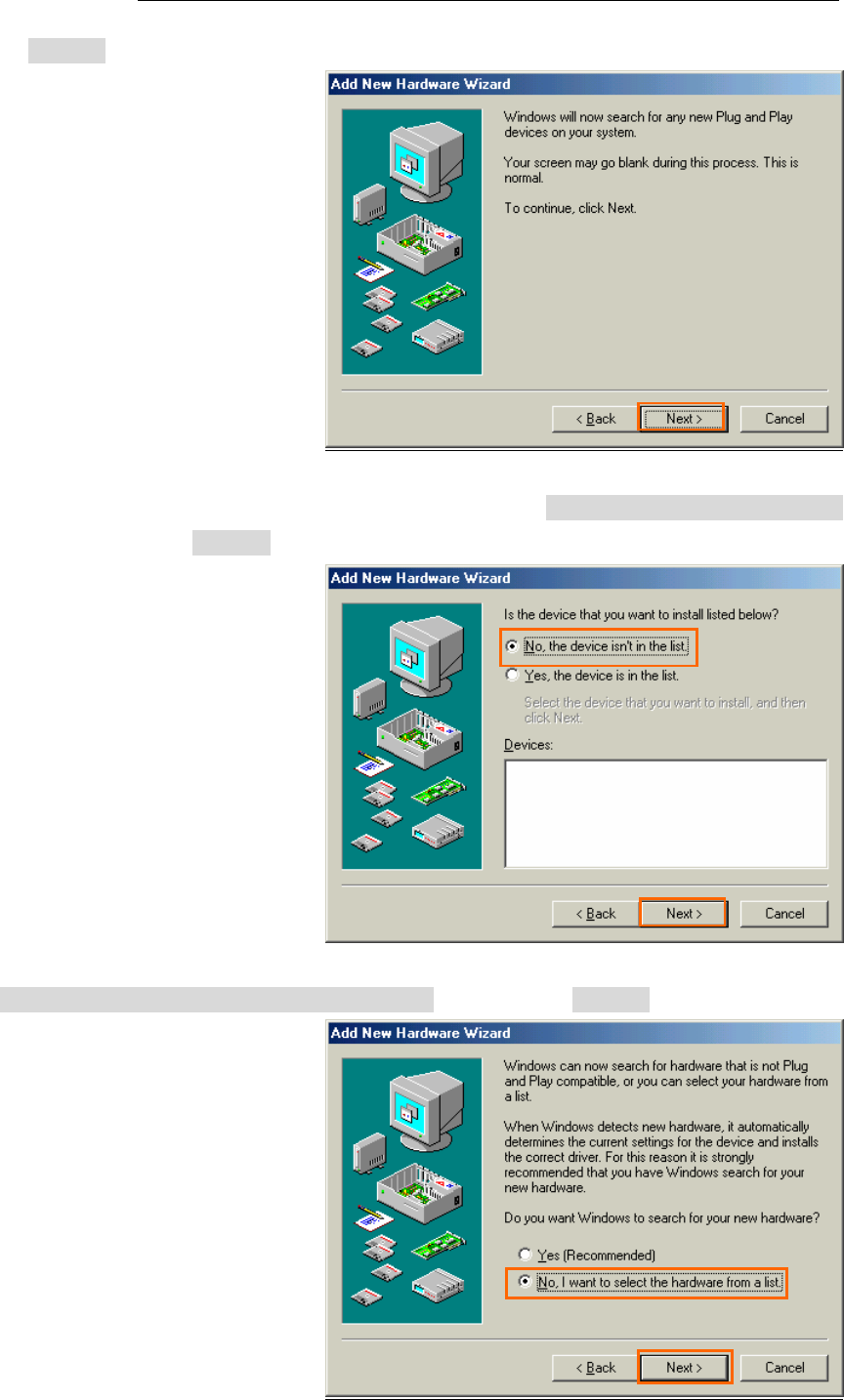 23. Select [No, I want to select the hardware from a list.], and click the [Next >] button.