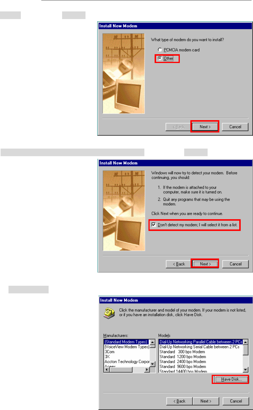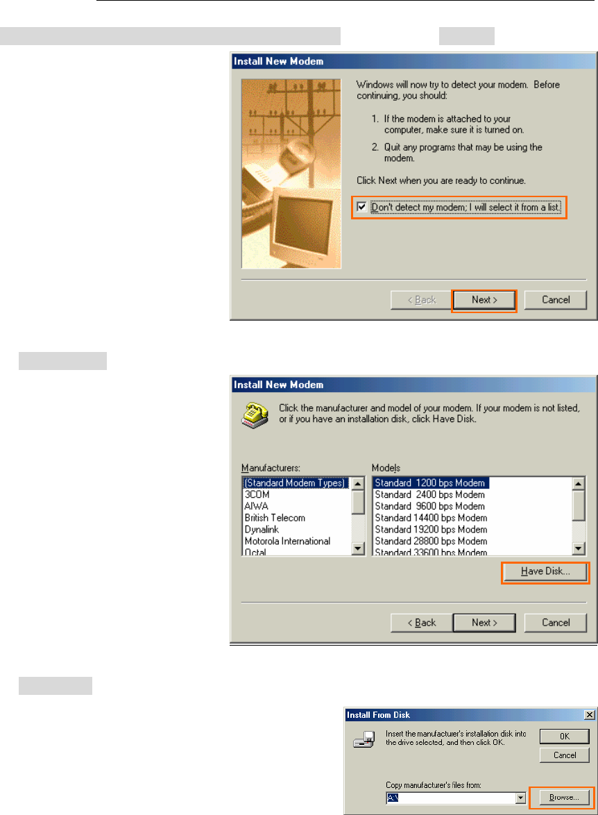 36. Check [Don’t detect my modem, I will select it from a list] and click the [Next >] button.
