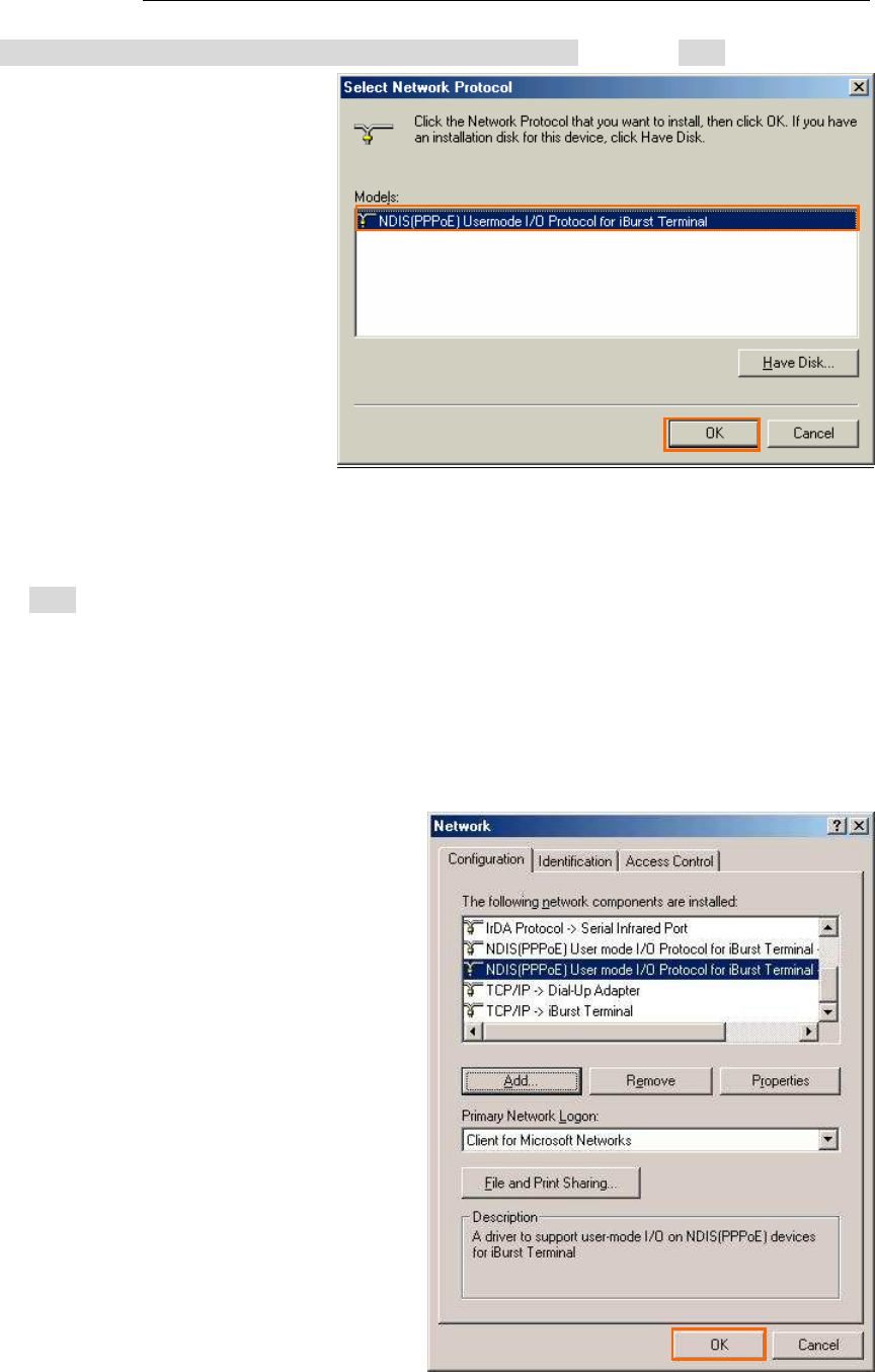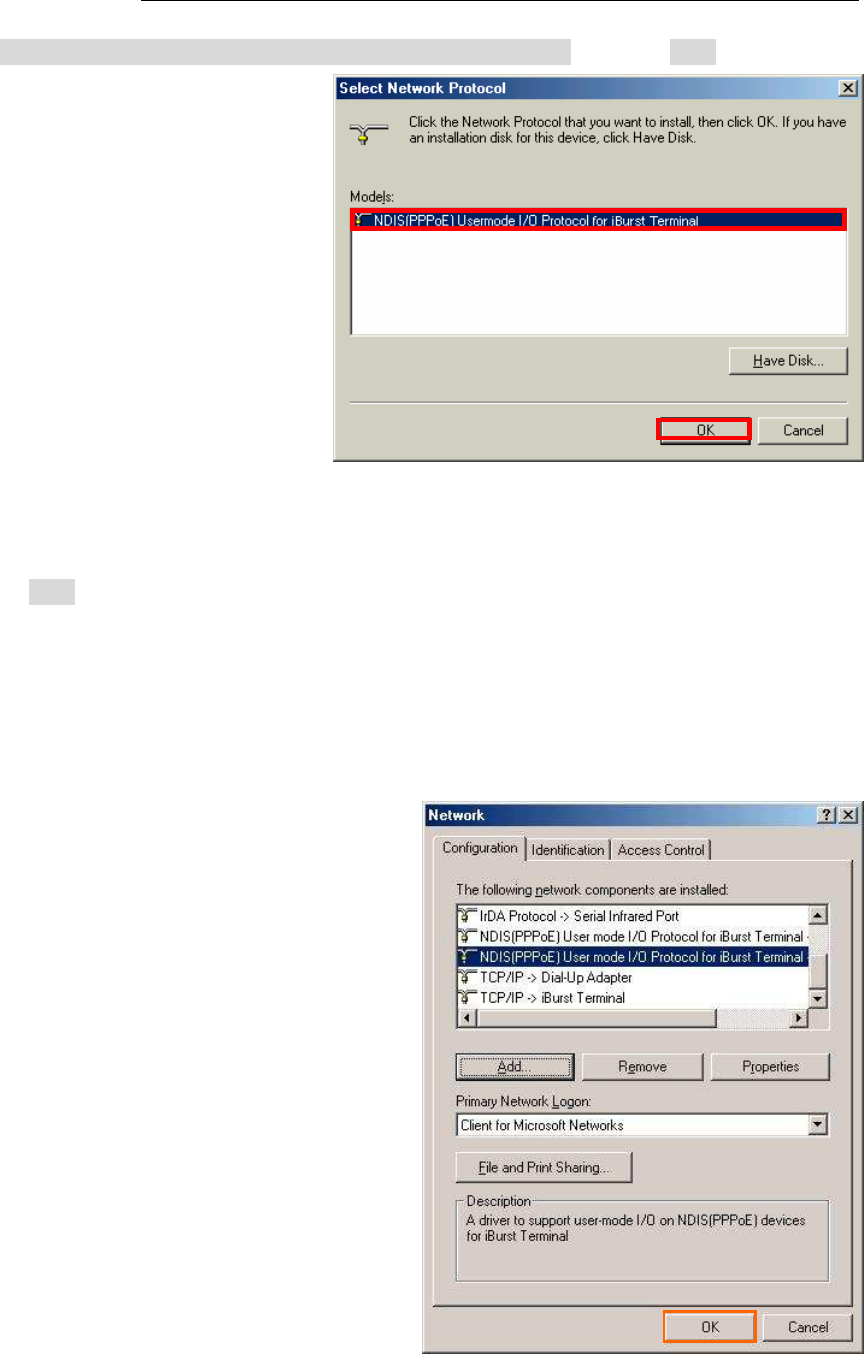 52. Select [NDIS(PPPoE) Usermode I/O Protocol for iBurst Terminal], click the [OK] button.