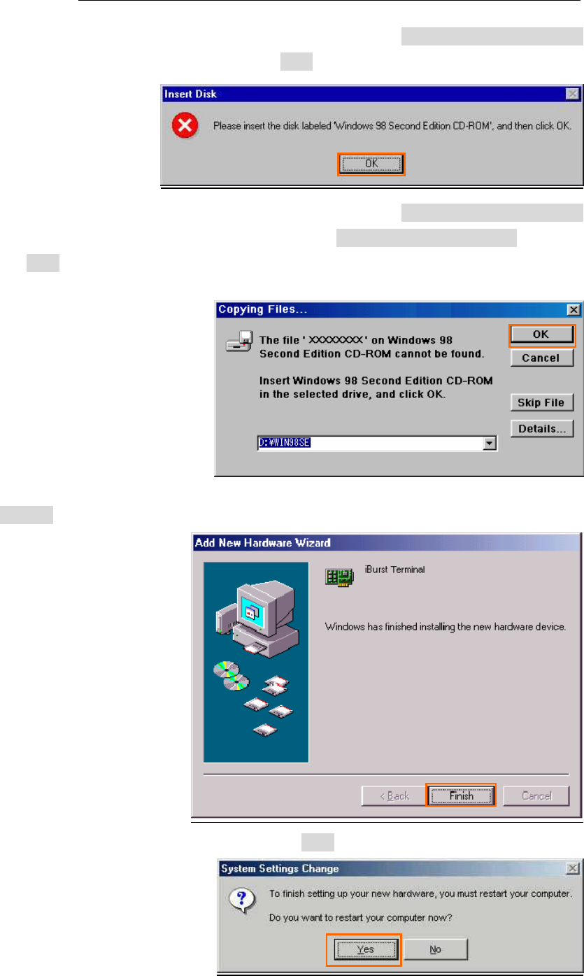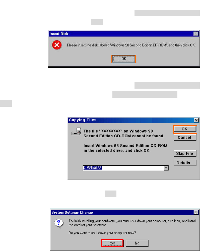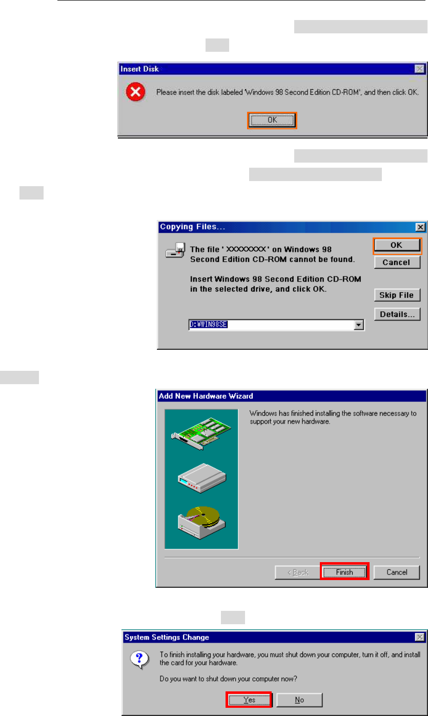 NOTE: If the dialog window as shown below appears, insert [Windows 98SE CD-ROM]