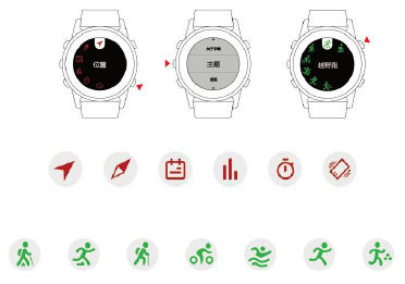 Long press UP button to open movement function: hiking, cross country race, mountaineering,cycling,