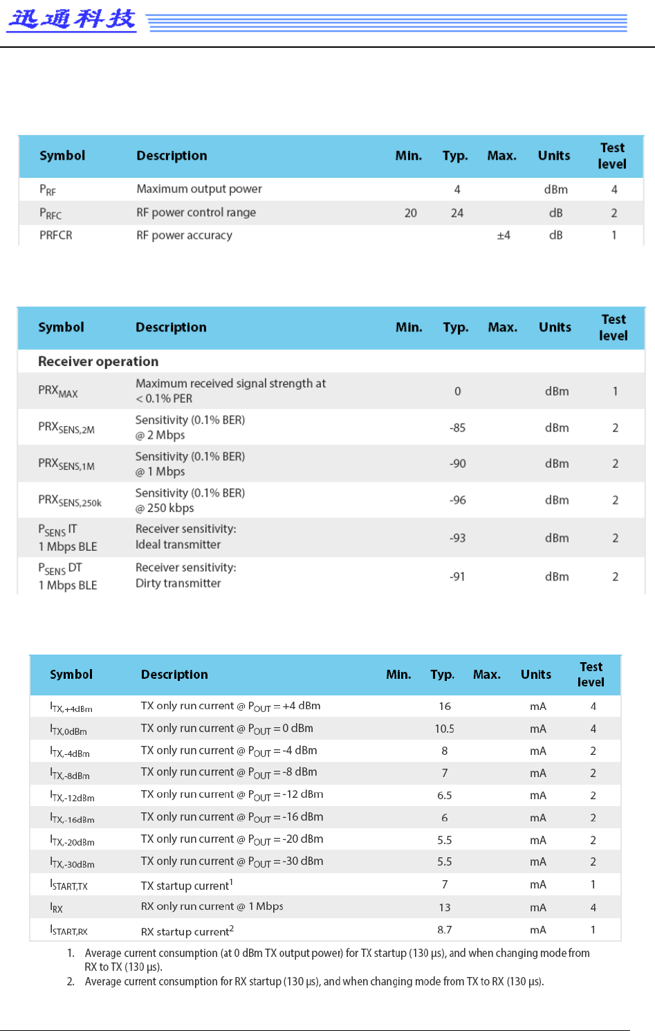 -93 dBm sensitivity in Bluetooth® low energy mode, -96 dBm sensitivity@250kbps,