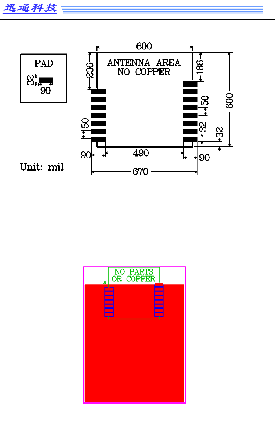 under and extending out from the antenna portion of the module should be kept clear of copper and