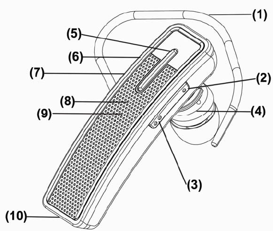 (1). Earhook; (2).Volume -; (3) Volume +; (4) Speaker; (5) Multifunction Key; (6)