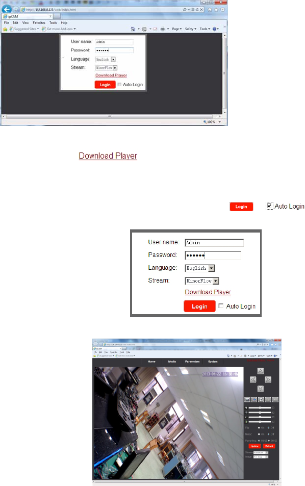1) Open the web page, enter IP address “http://X.X.X.X”. If the http port of IPC has been changed (if it is not “80”), it