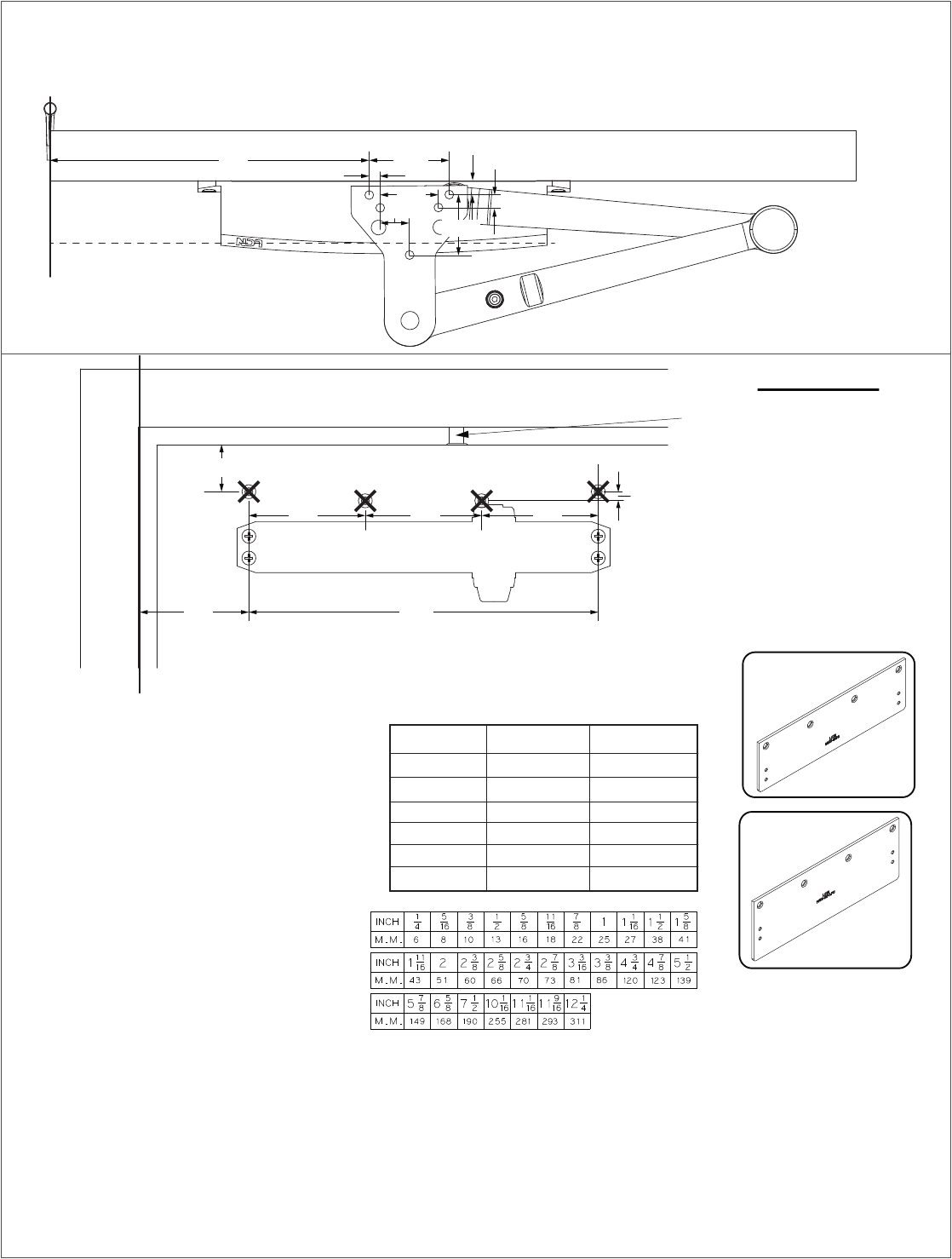 8. Using fasters provided mount drop plate with (4) 1/4 - 14 x 1 3/8 S.R.T. mount closer