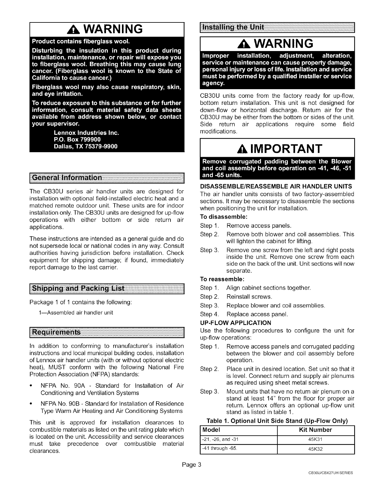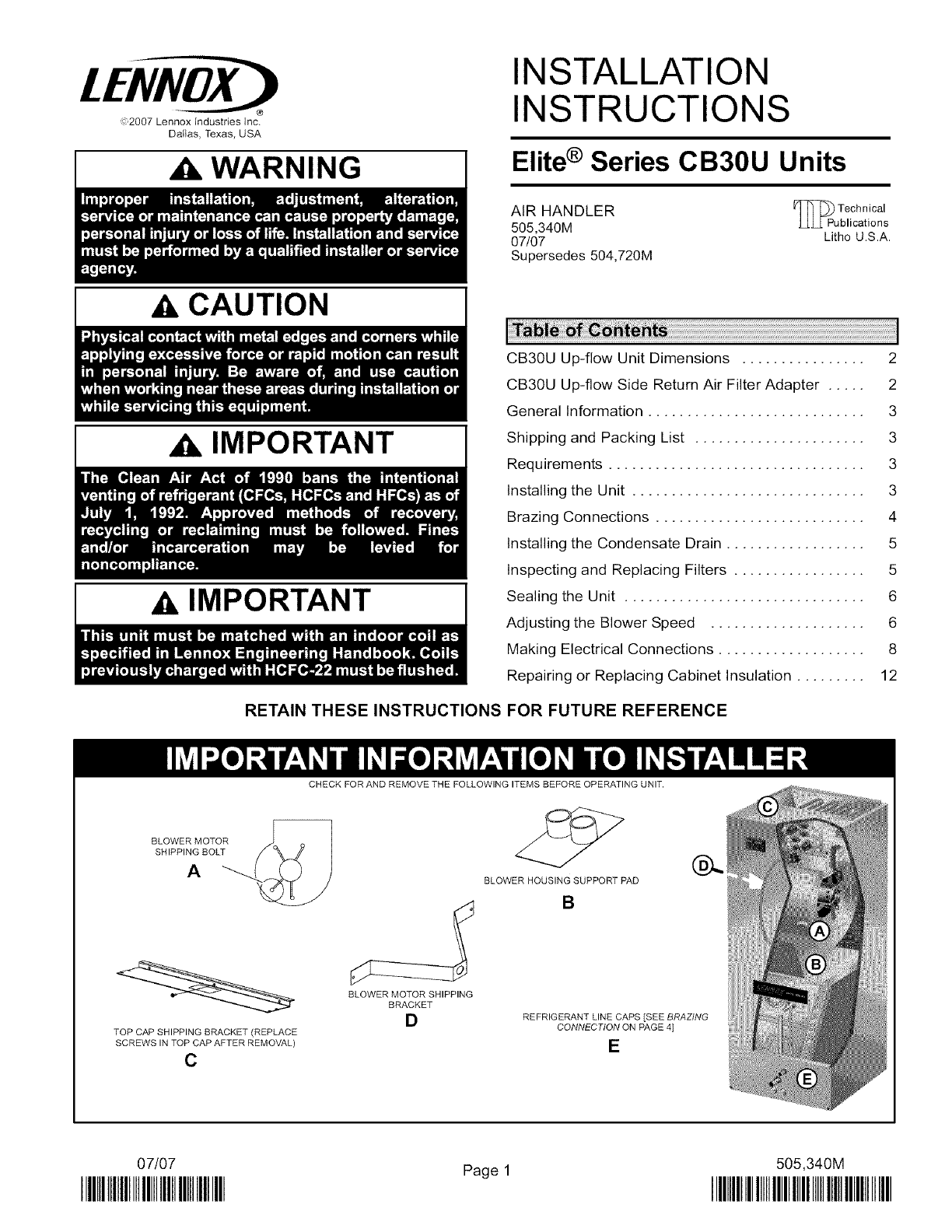 LENNOX Air Handler (indoor Blower&evap) Manual L0805327