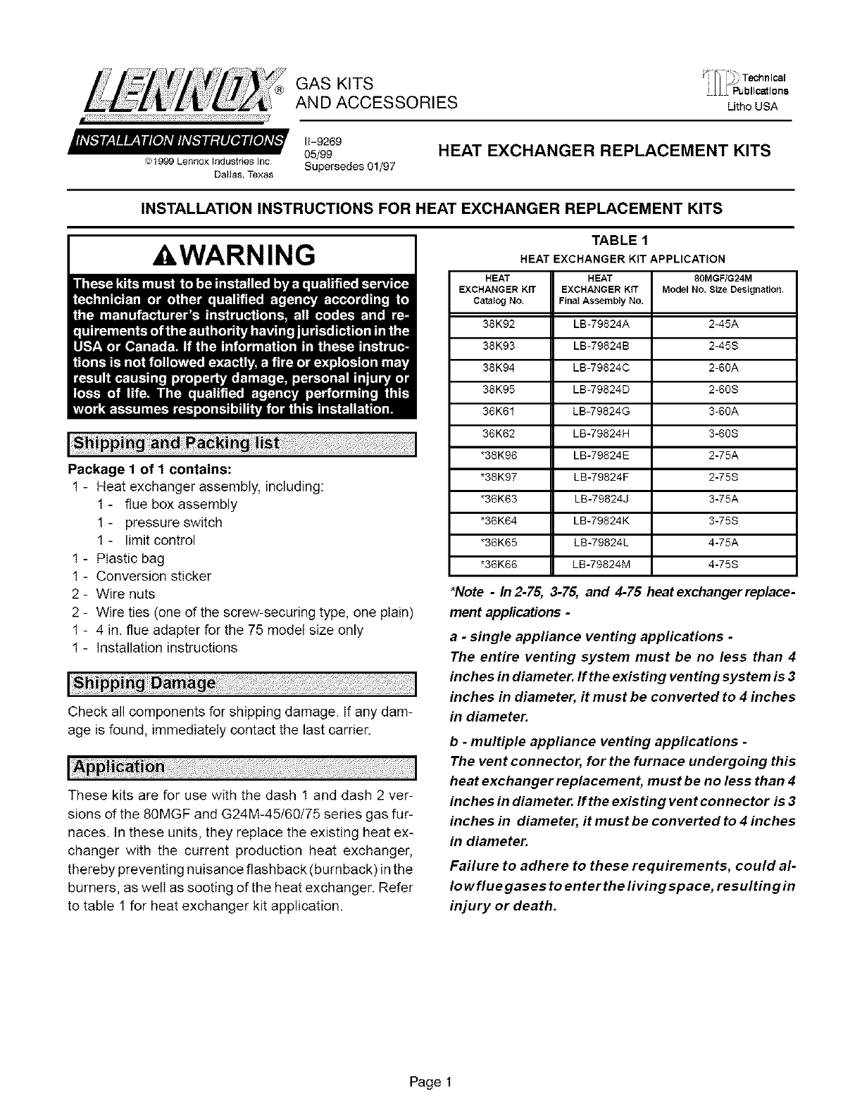 to table 1 for heat exchanger kit application.