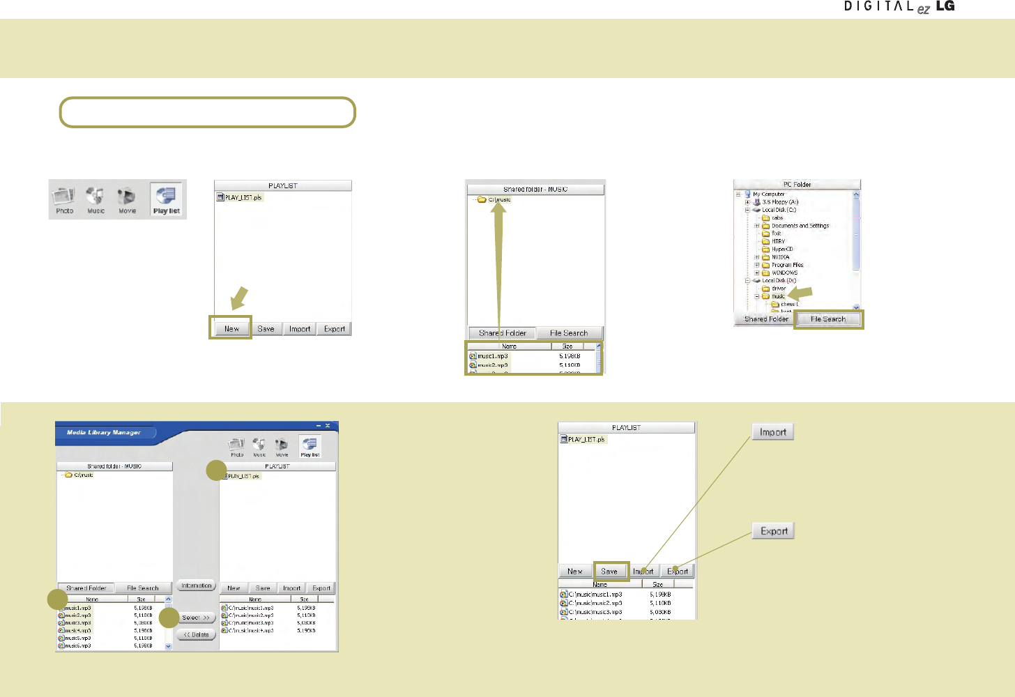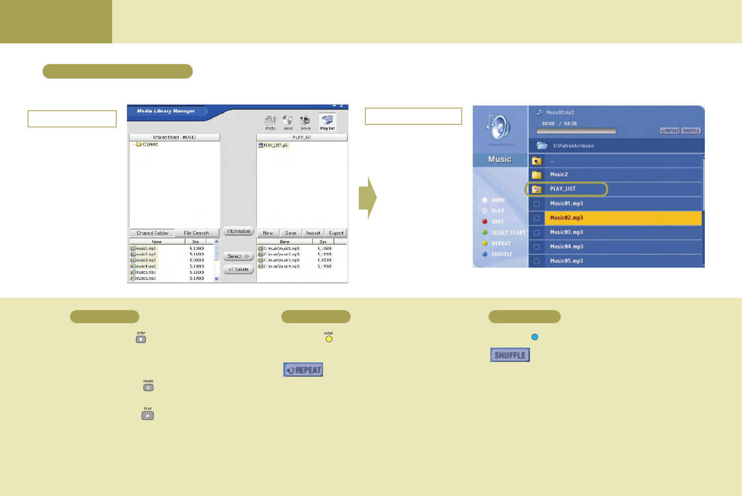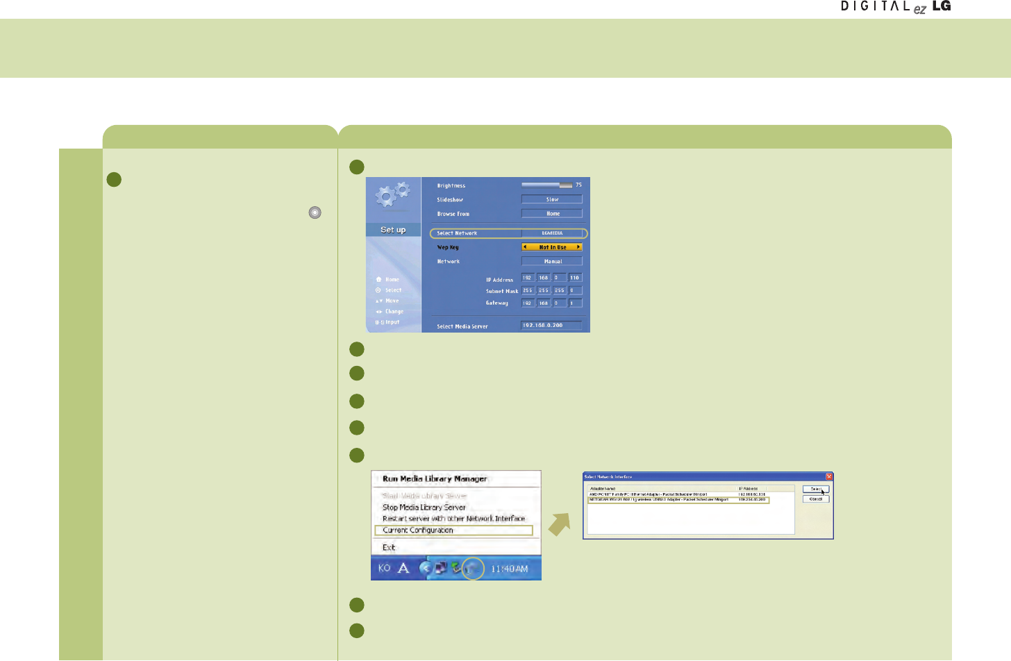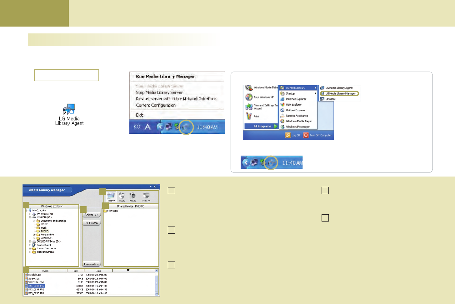 You should configure your computer network and install the Media Library program first to view or play back the picture, music or the movie in your computer using the Media Browser