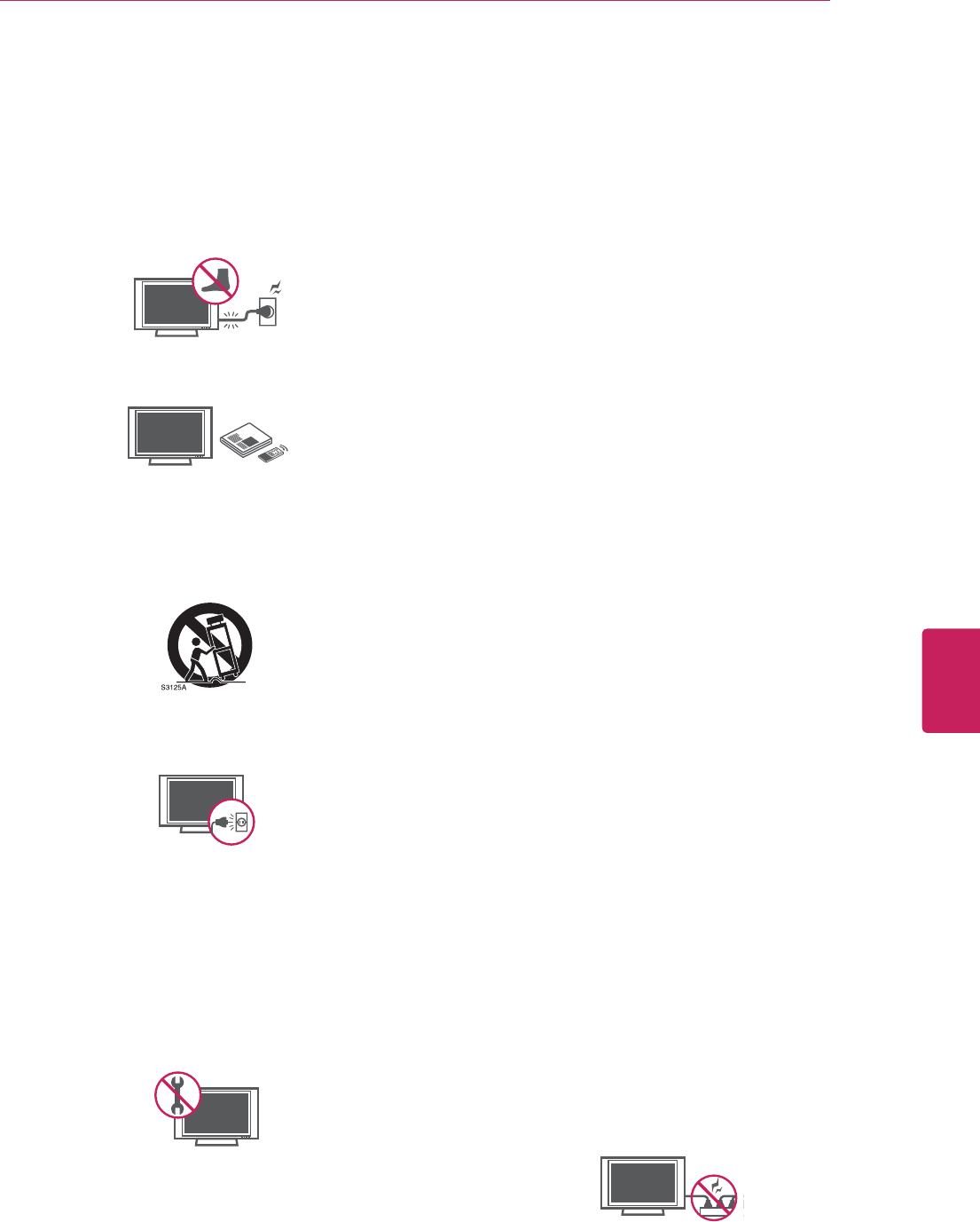 y Do not spray liquid onto the surface. If water enters the TV, it may result in fire, electric shock, or