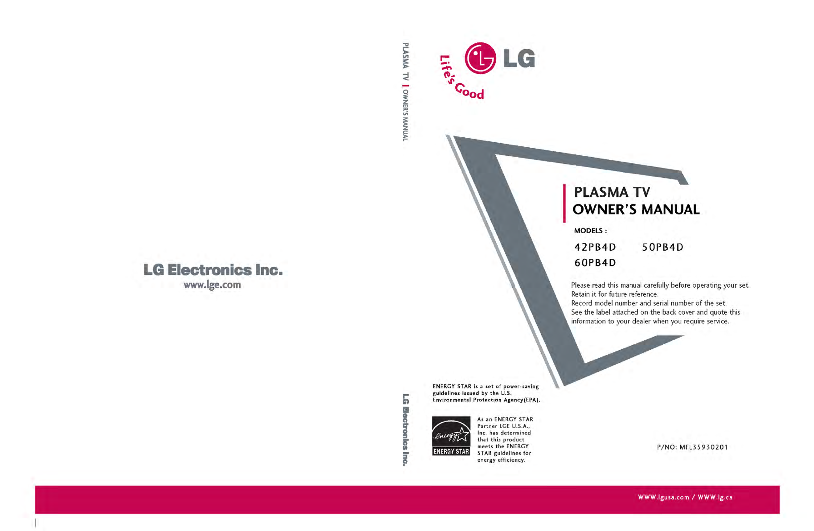 LG Electronics USA 42PB4DTUB PDP TV/MONITOR User Manual Manual 1 of 4