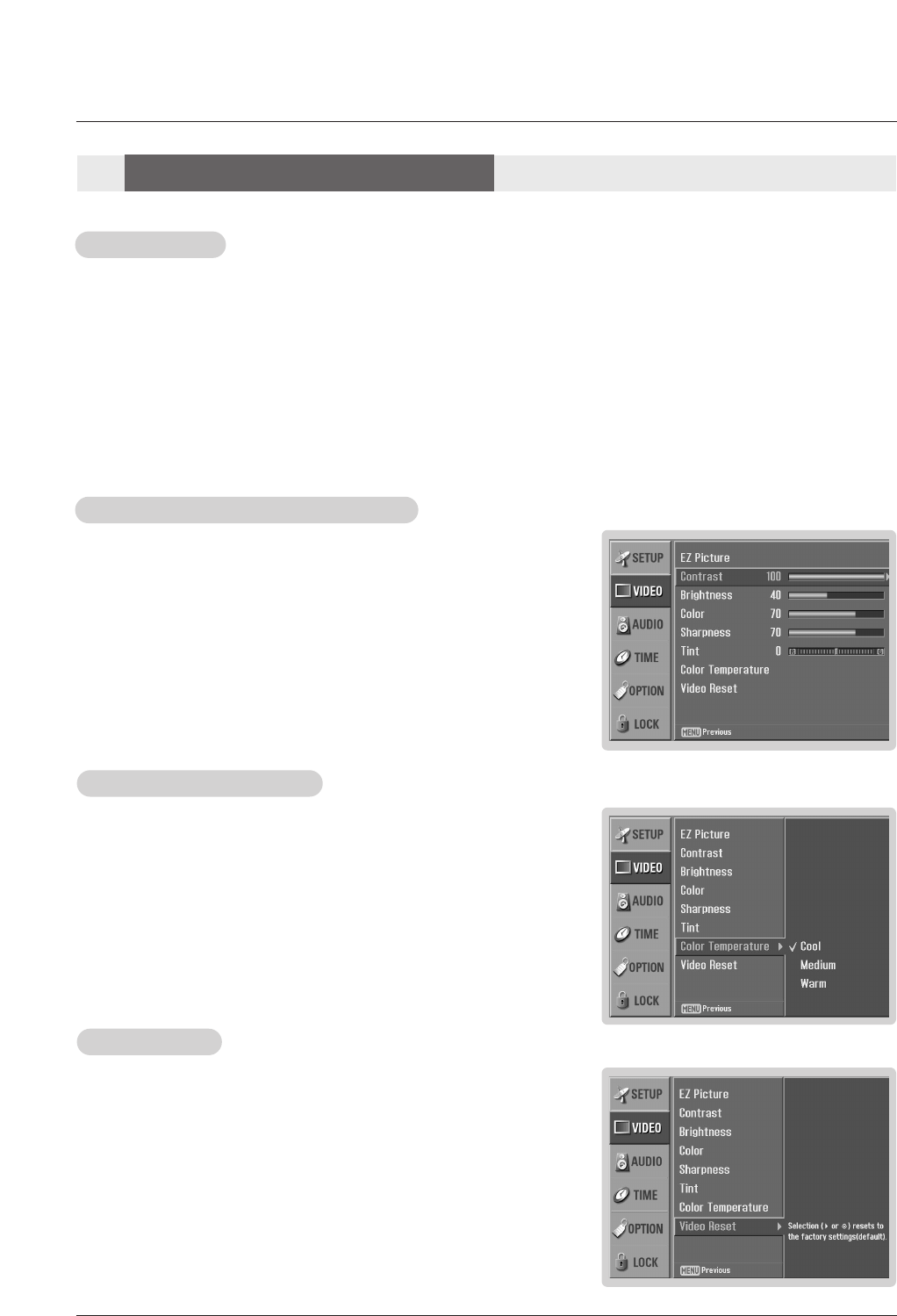 - When adjusting Video menu options (contrast, brightness, color, sharpness, tint, and color temperature) manually, EZ