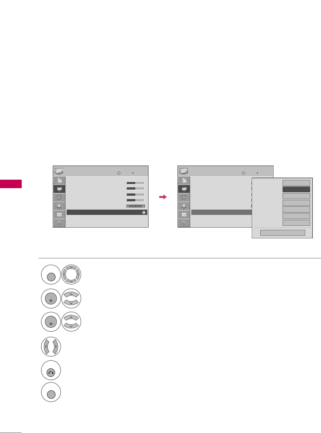 There are factory presets for picture settings available in the user menus. You can use a preset, change each