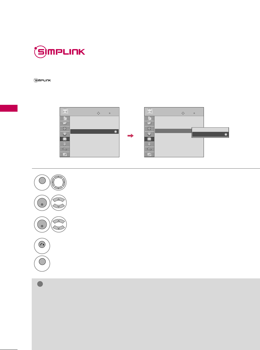 Note: To operate SIMPLINK, an HDMI cable over Version 1.3 with *CEC function should be used. (*CEC: Consumer