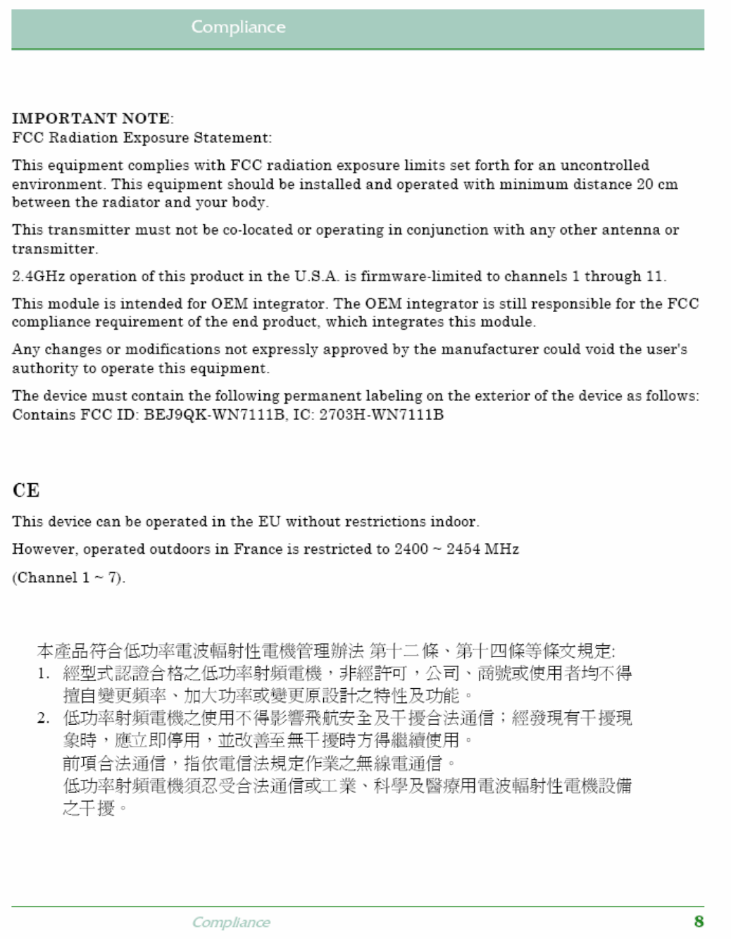 LG Electronics USA 9QK-WN7111B WLan Adapter Card User Manual ZZ
