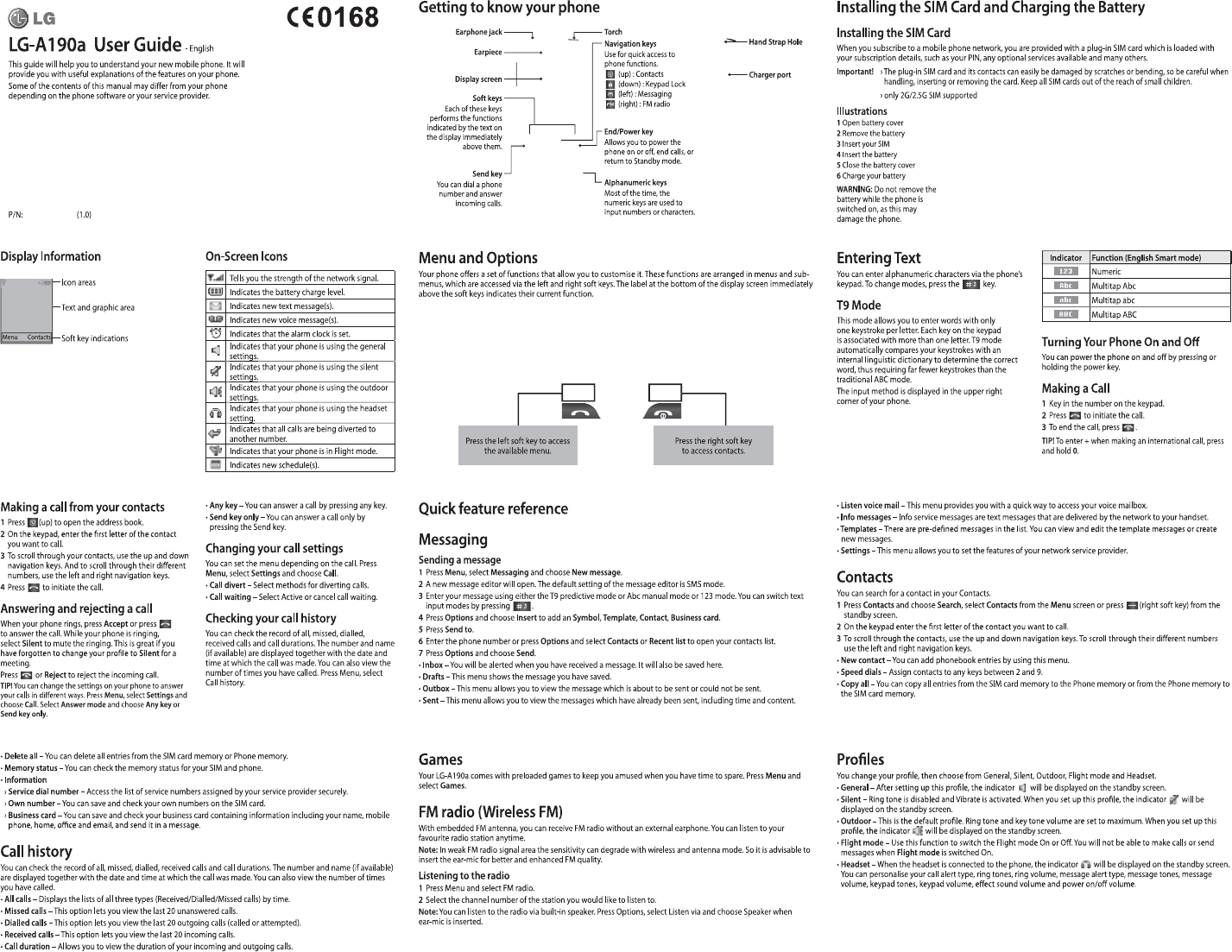 LG Electronics USA A190A Cellular/PCS GSM Phone User Manual