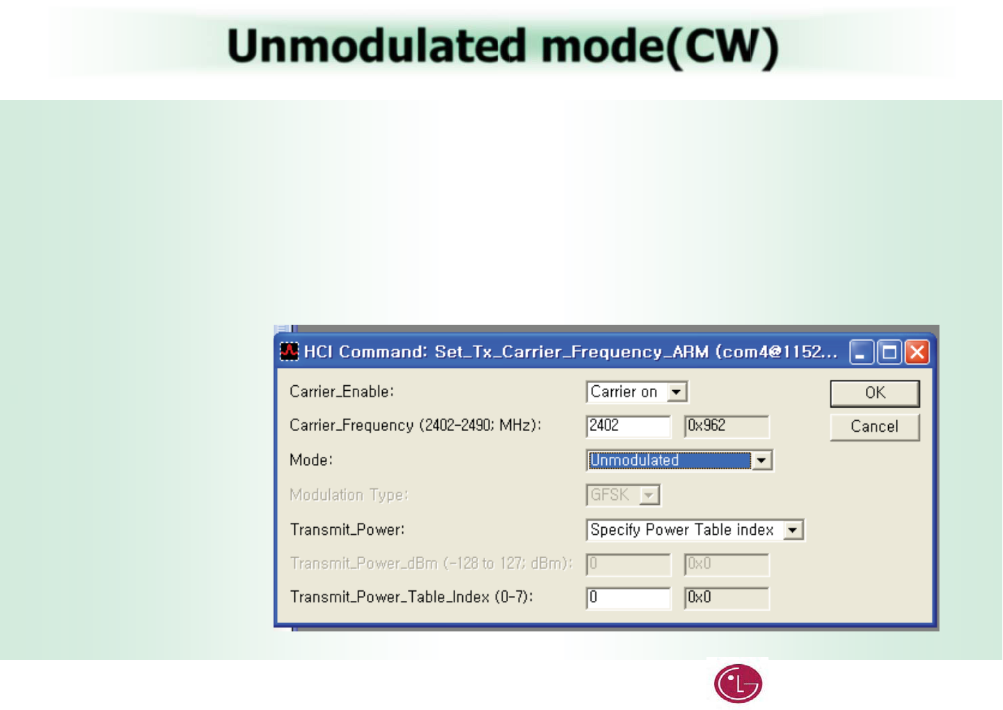 b. In the Carrier_Frequency… field, enter the desired output frequency. ( Low: 2402 , Mid : 2441 , High:2480 )