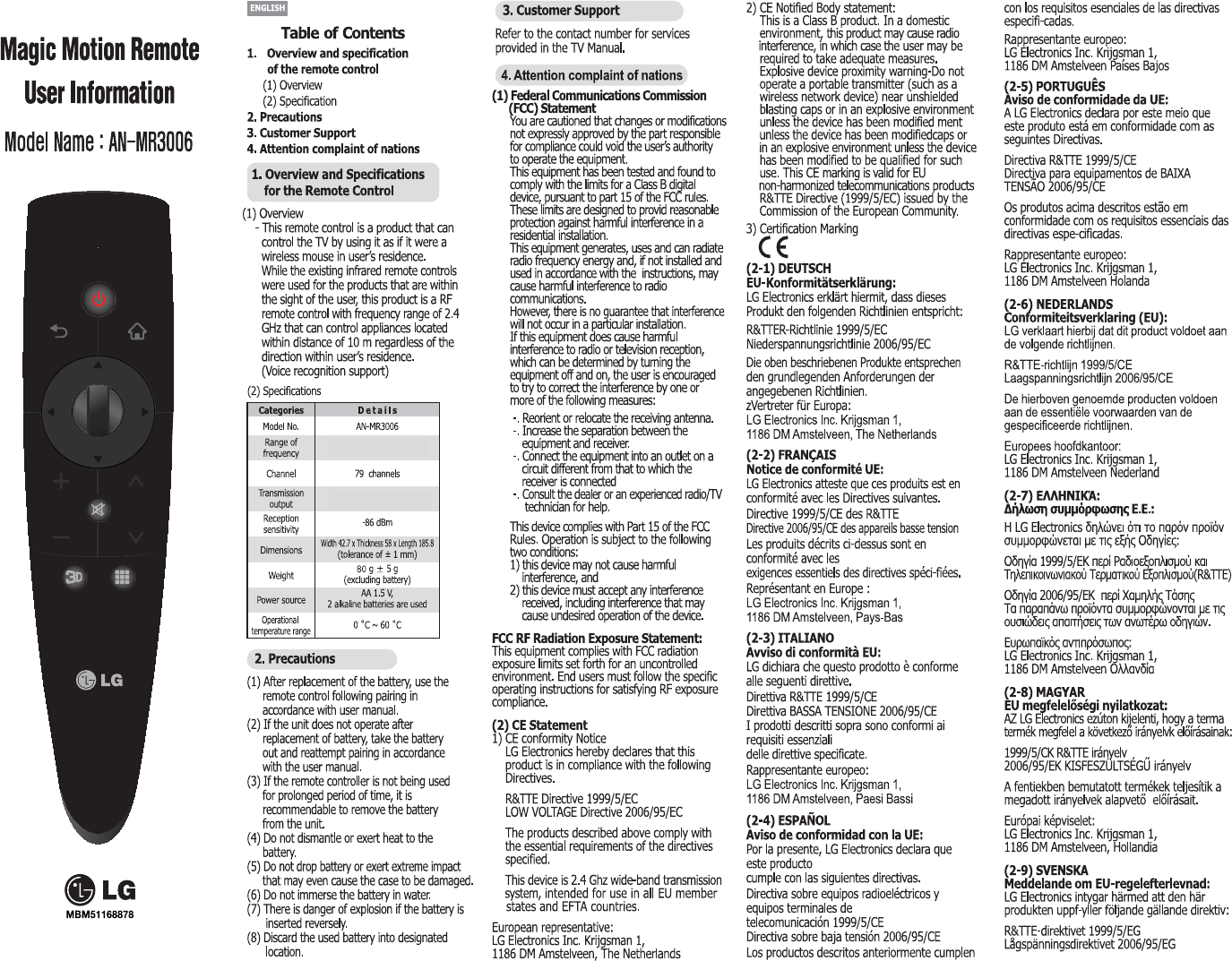 LG Electronics USA MR3006 Magic Remote Control User Manual 1P