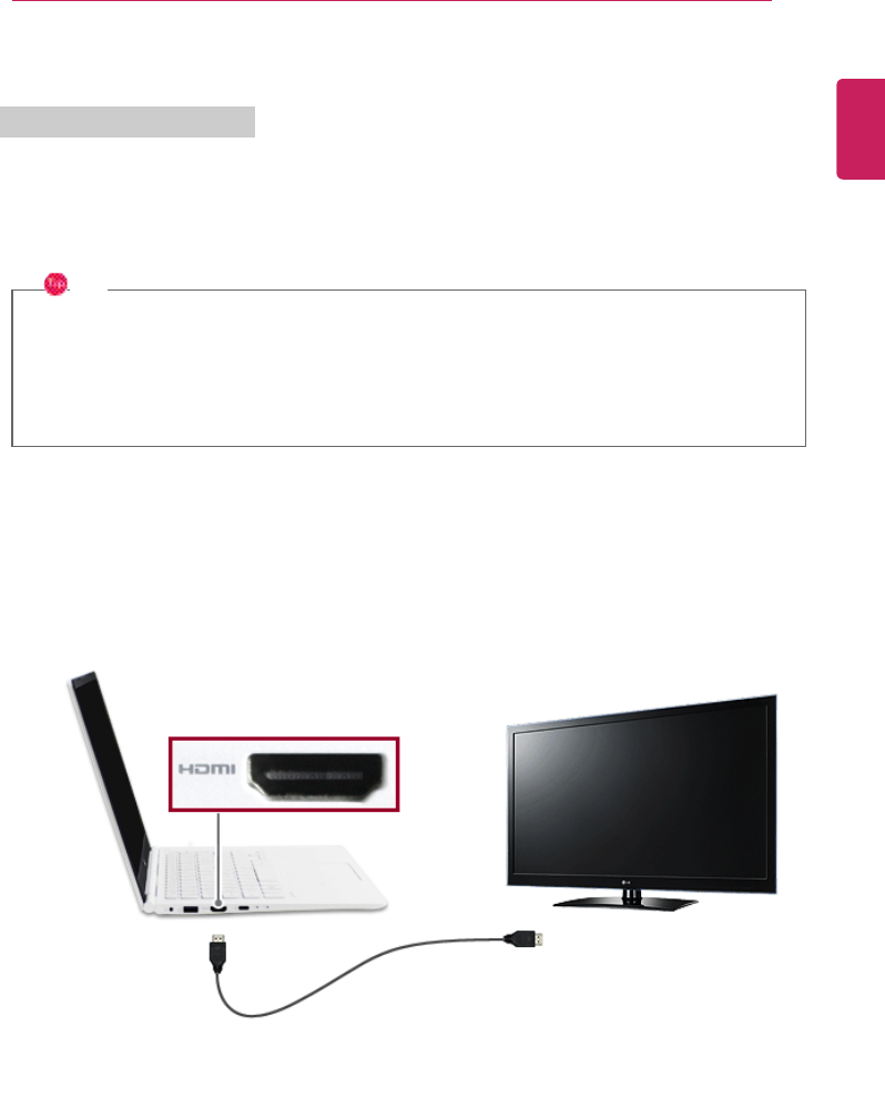 1Connect the HDMI cable to the PC and the external device (TV, monitor) that supports HDMI.