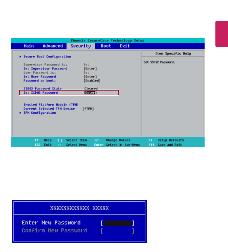Depending on the model, the menu name may be displayed as SSD Password, NVMe