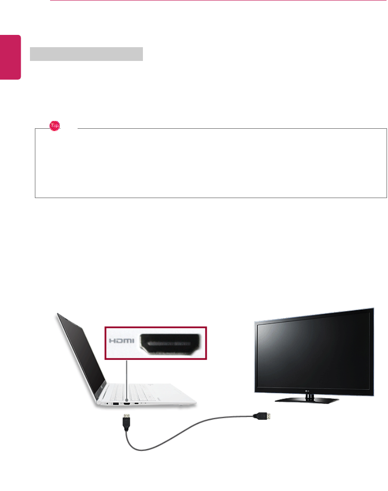 1Connect the HDMI cable to the PC and the external device (TV, monitor) that supports HDMI.