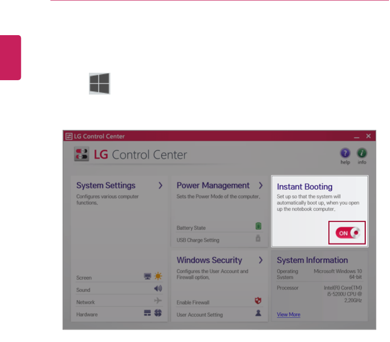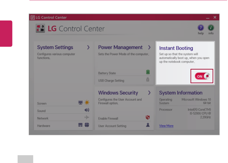 2On LG Control Center screen, set the [Instant Booting] to [ON].