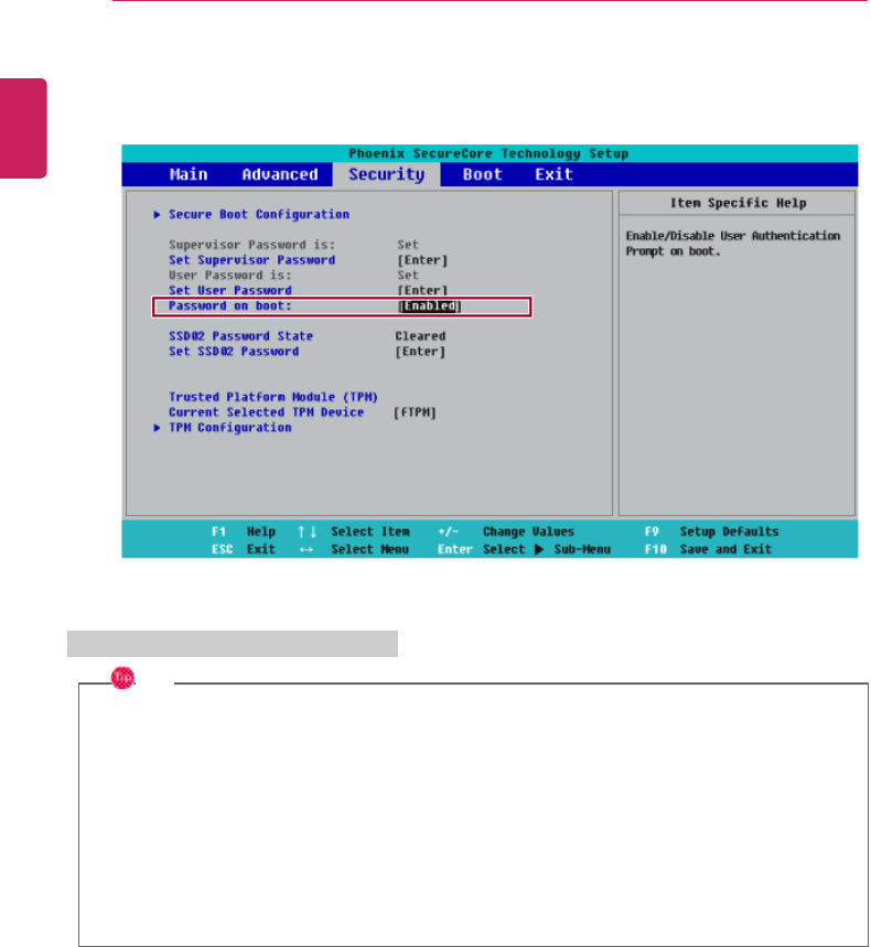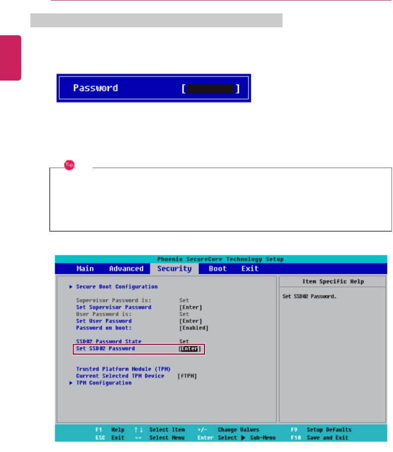 Depending on the model, the menu name may be displayed as SSD Password, NVMe