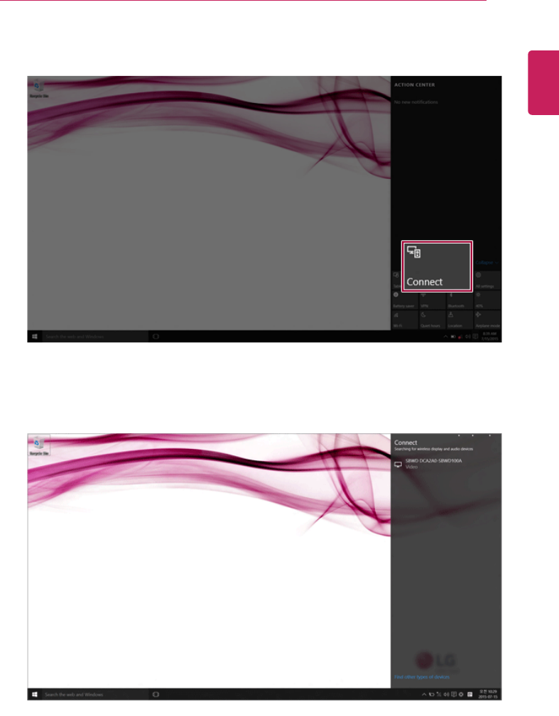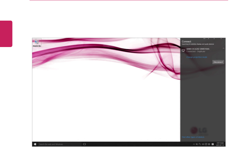 The wireless display feature connects the PC screen and sound to a display (TV, projector,