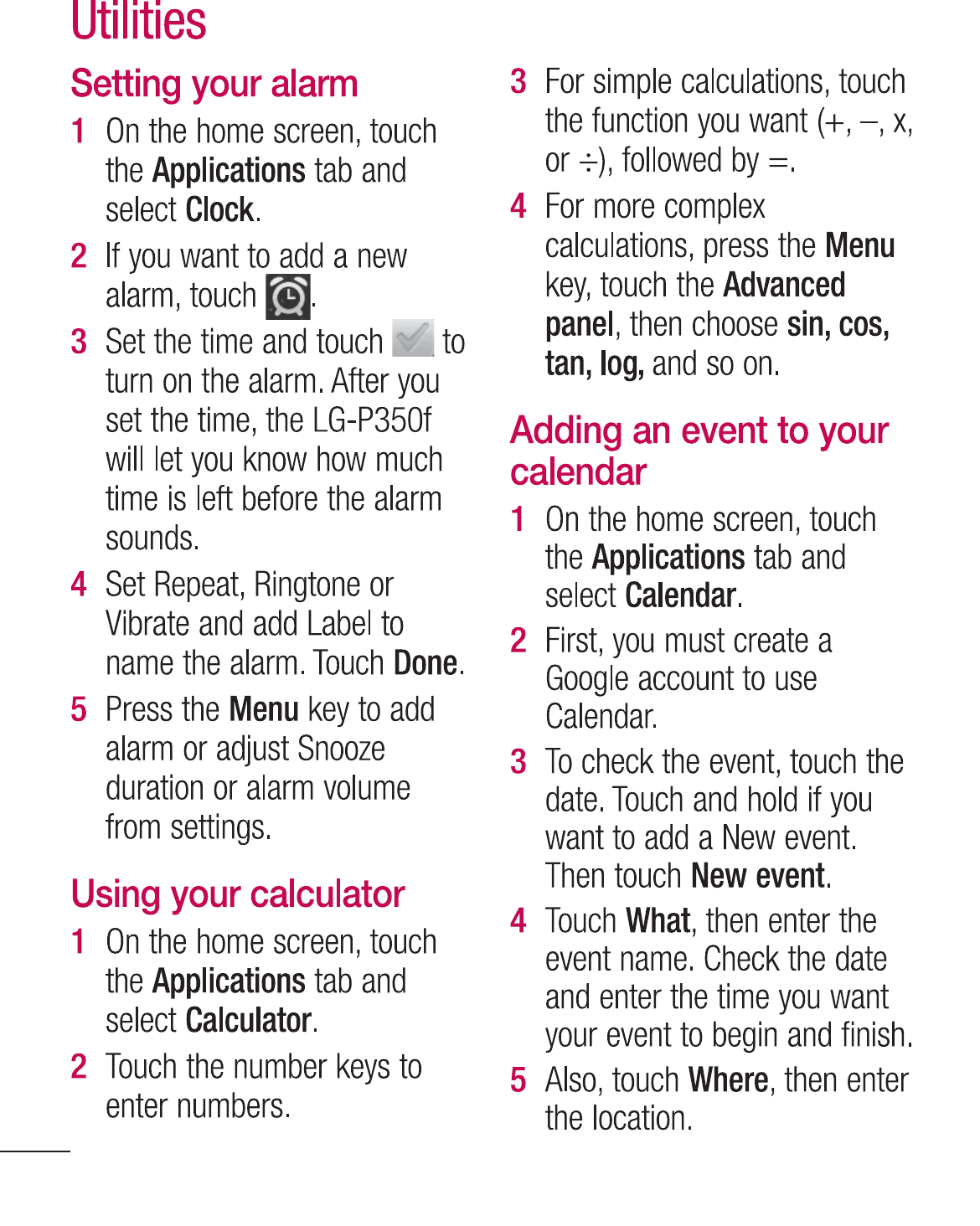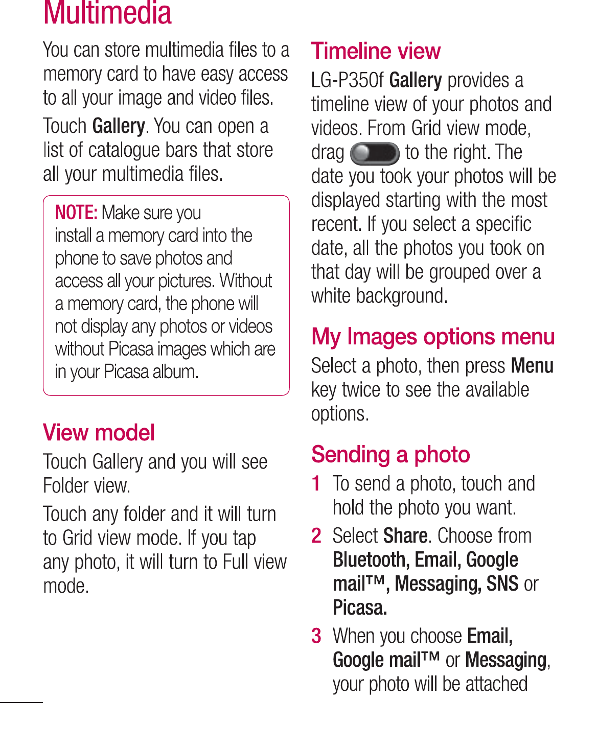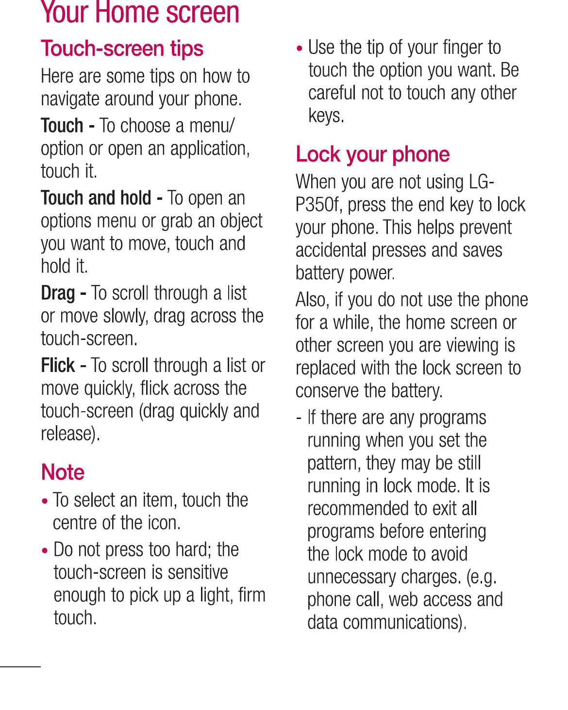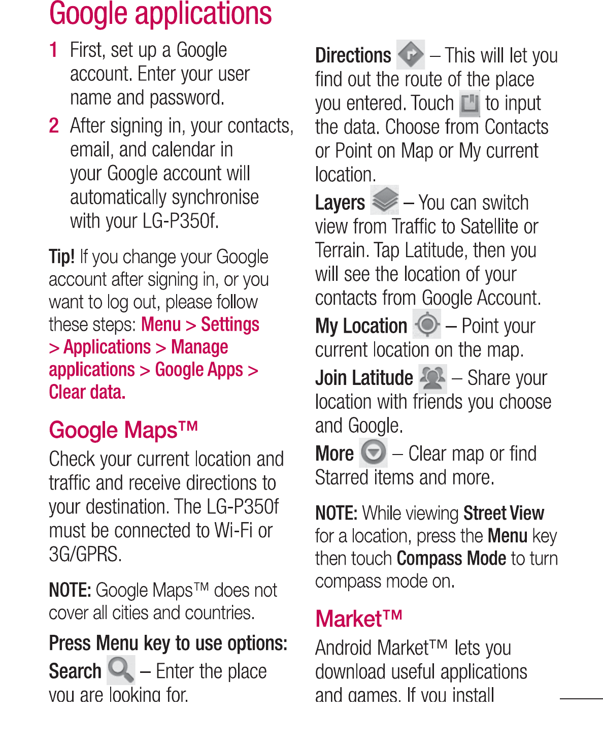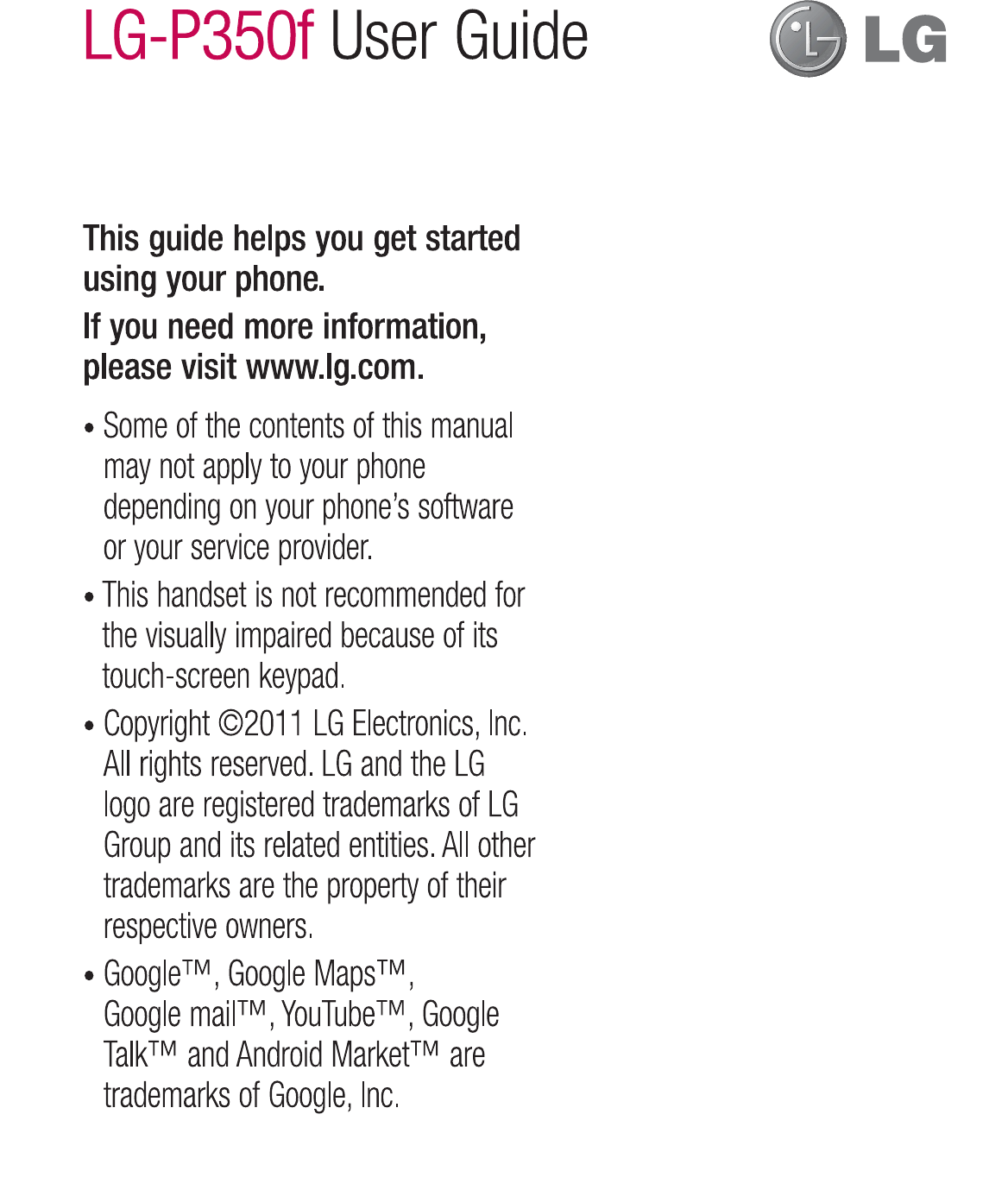 LG Electronics USA P350F Cellular/PCS GSM/EDGE and Cellular WCDMA Phone with WLAN and Bluetooth User Manual 2011021113255230941 LG P350f