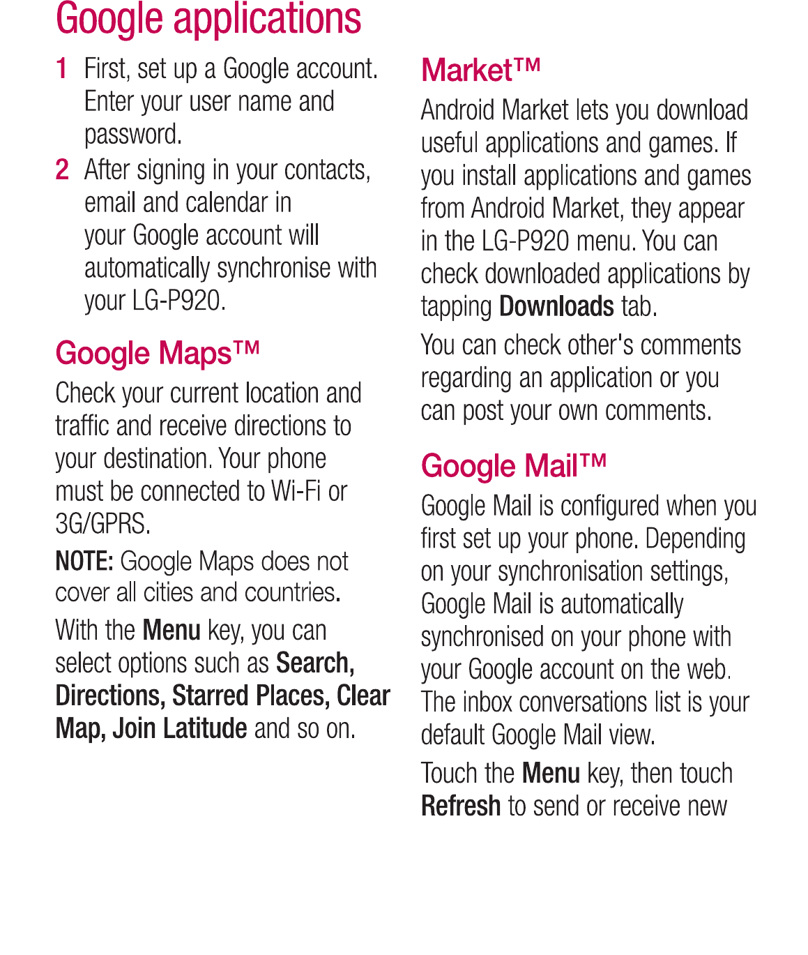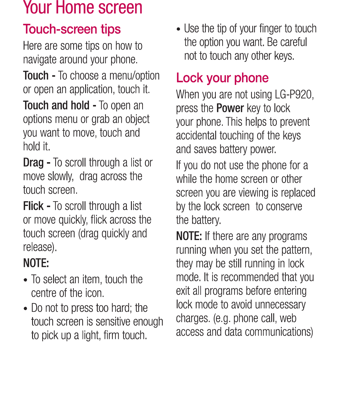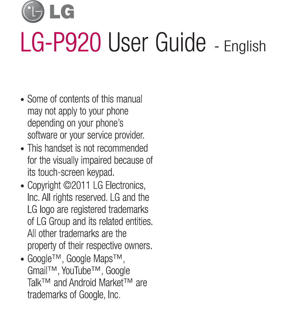LG Electronics USA P920 Cellular/PCS GSM/EDGE and AWS/PCS WCDMA Phone with WLAN and Bluetooth User Manual