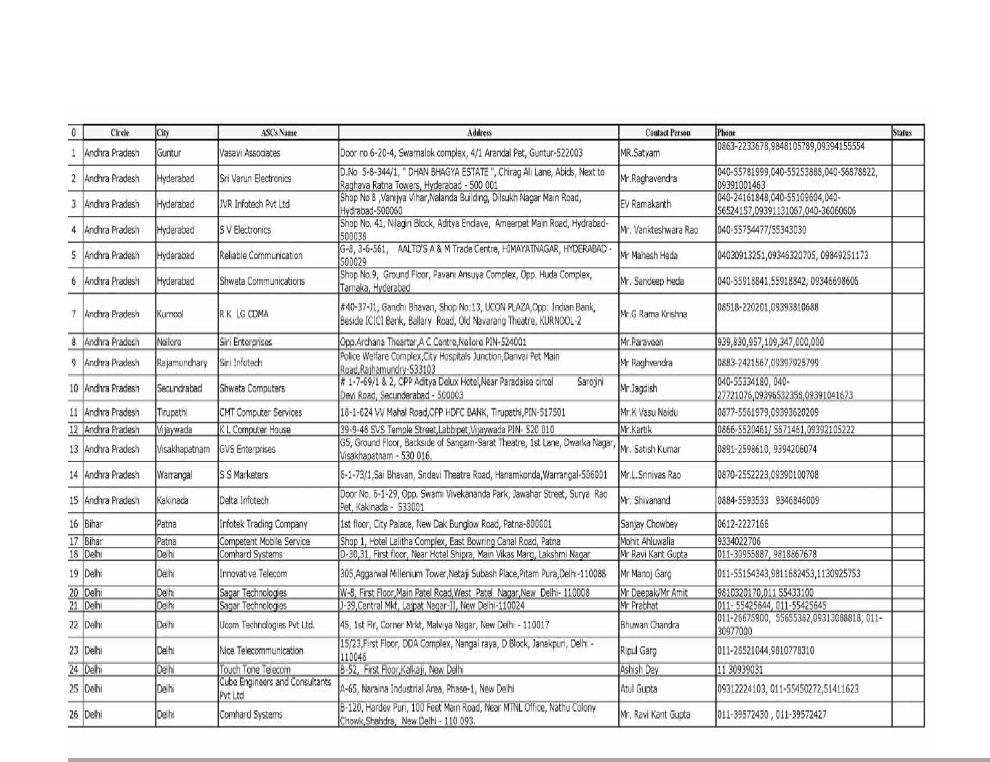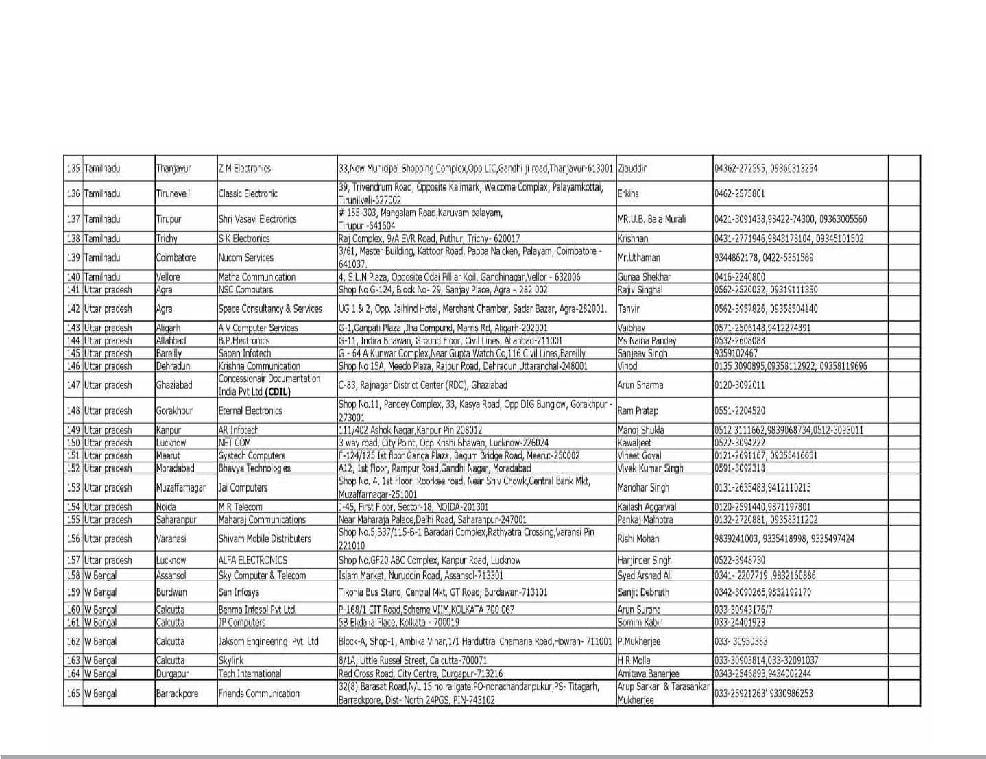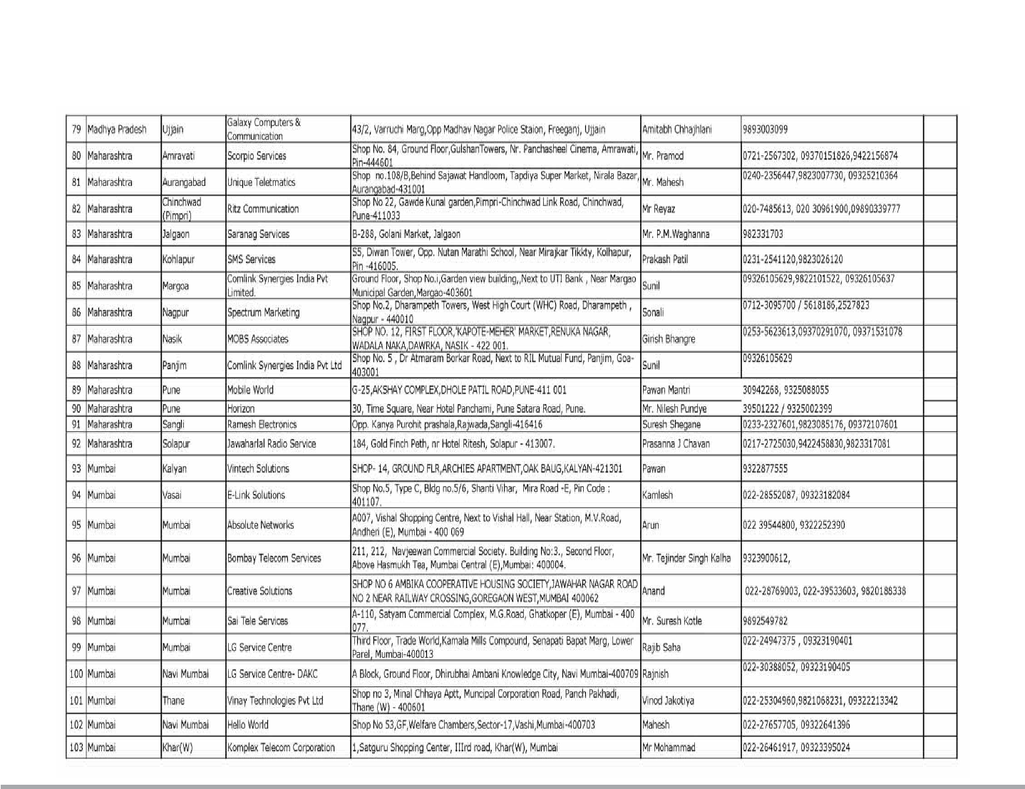 Service Center List