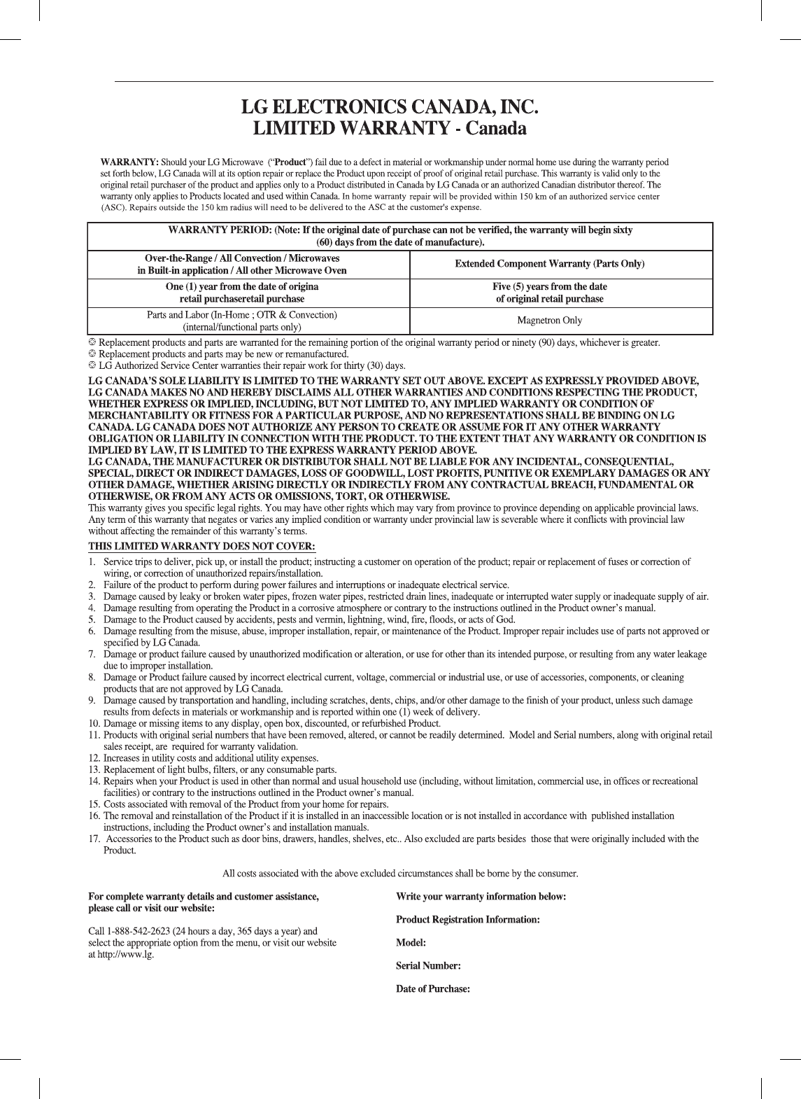 LG Electronics, Inc. will repair or replace your product, at LG’s option, if it proves to be defective in material or