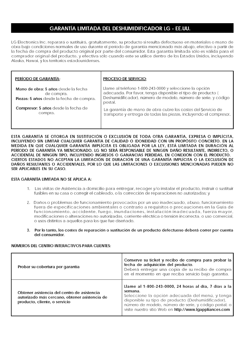 LG Electronics Inc. reparara o sustituira, gratuitamente, su producto si resulta defectuoso en materiales o mano de
