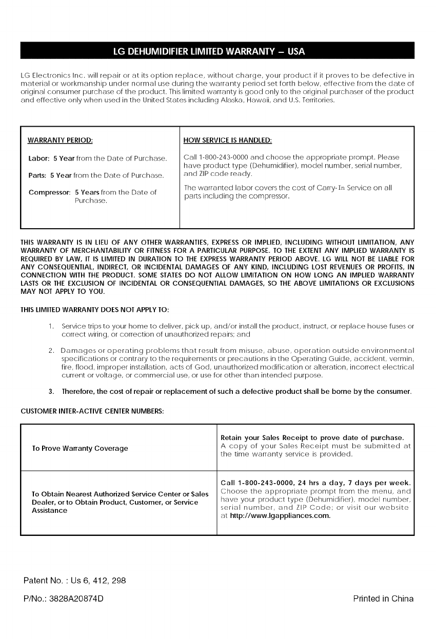 LG Electronics Inc. will repair or at its option replace, without charge, your product if it proves to be defective in
