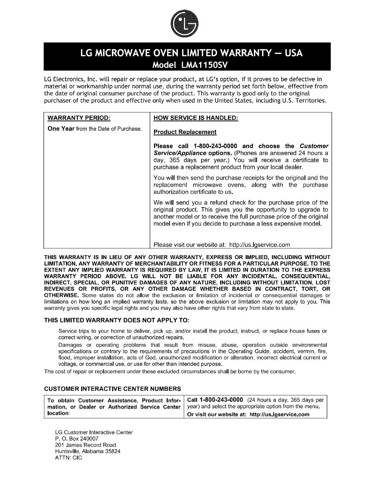 LG Electronics, Inc. will repair or replace your product, at LG's option, if it proves to be defective in