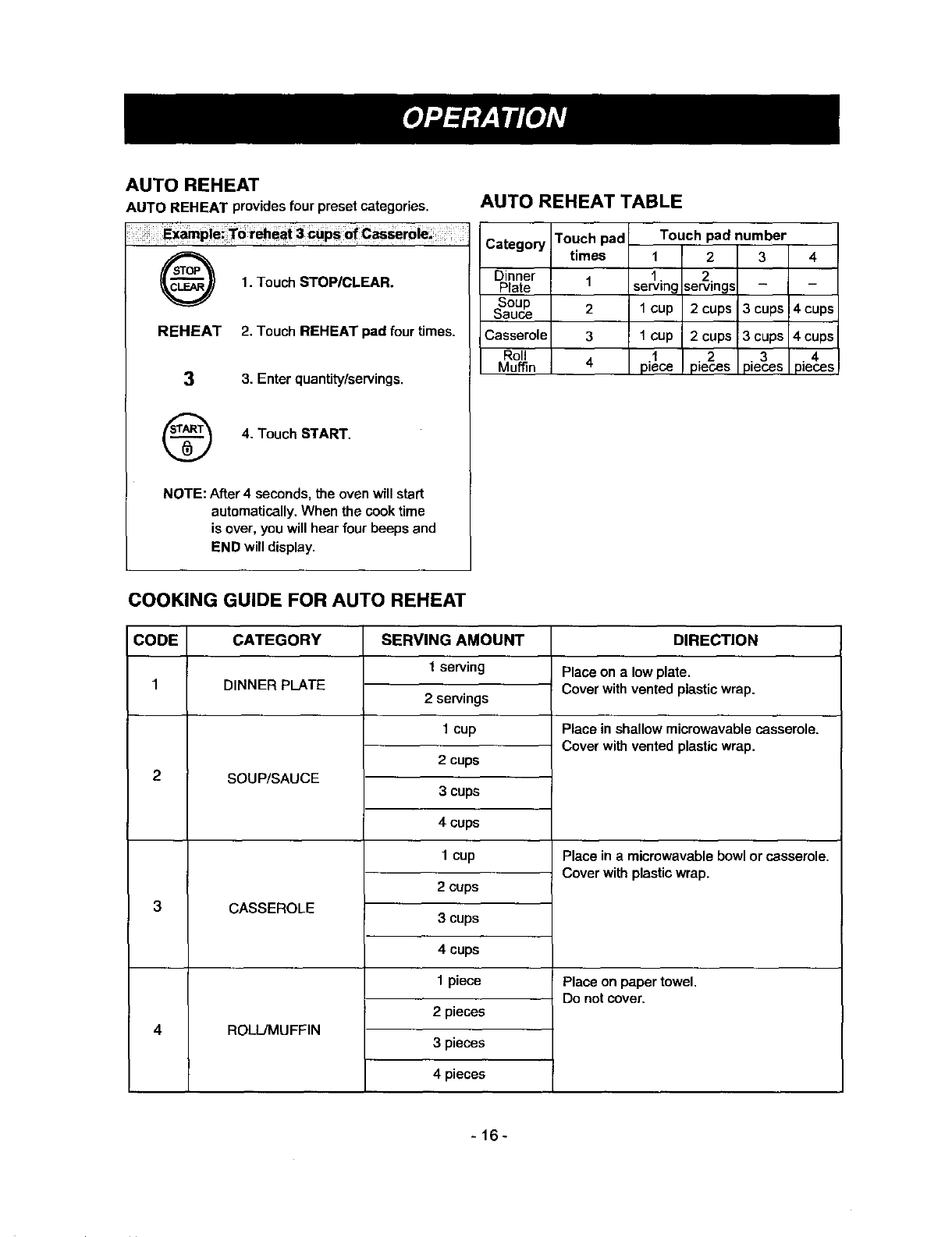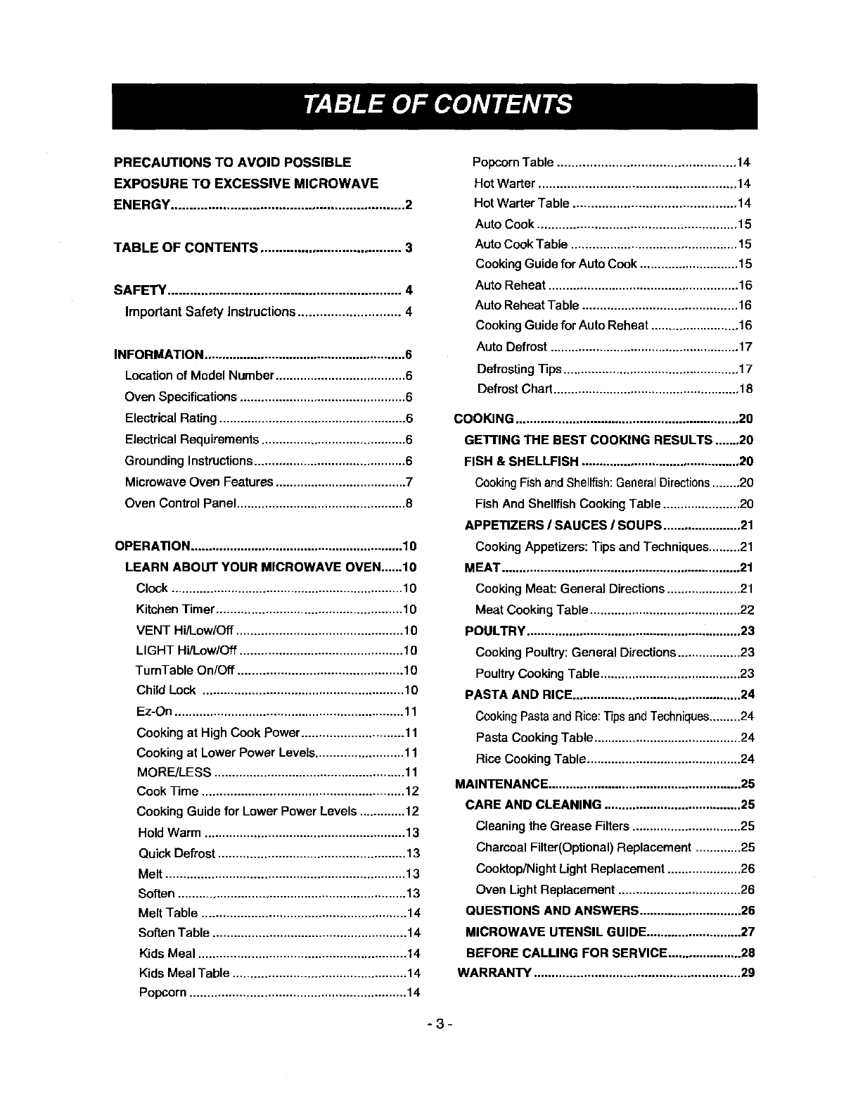 Cooking Guide for Auto Reheat ......................... 16