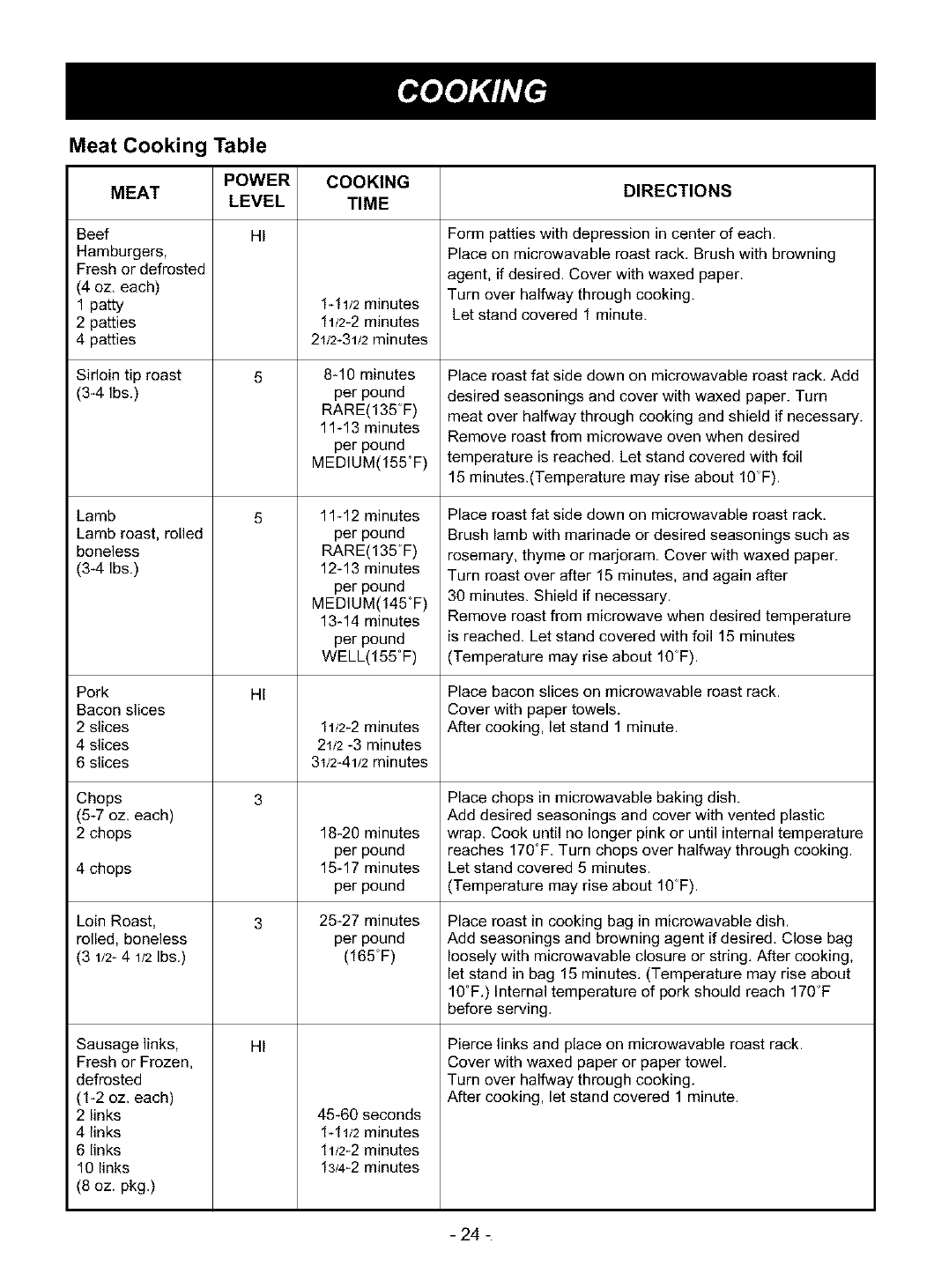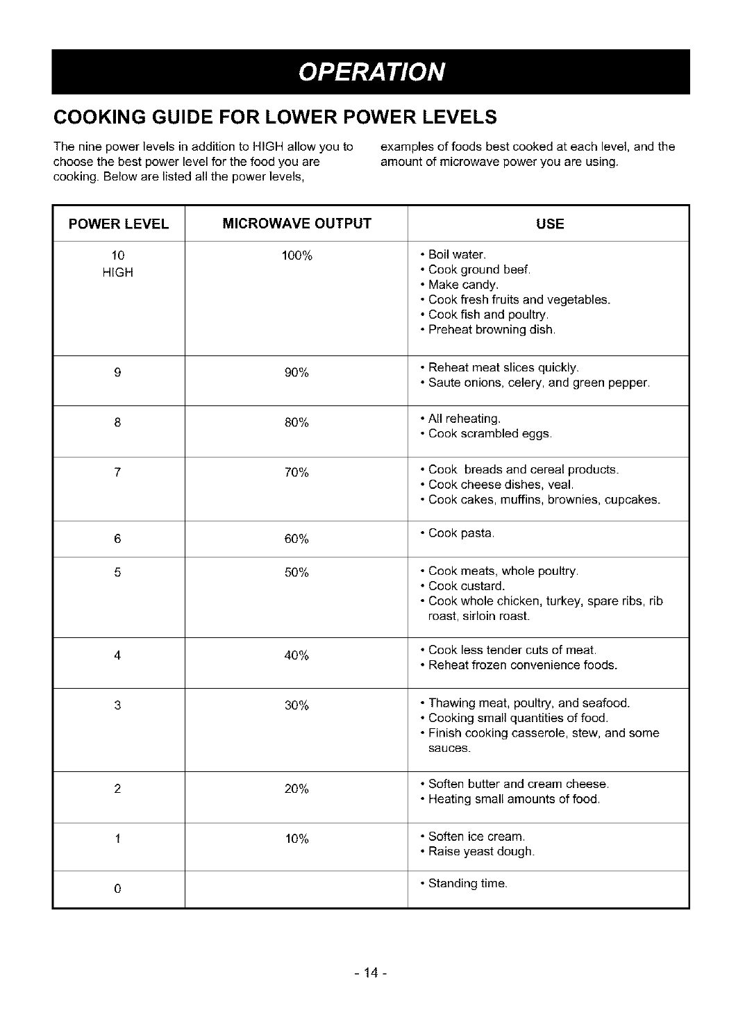 Cooking Guide for Lower Power Levels ........ 14