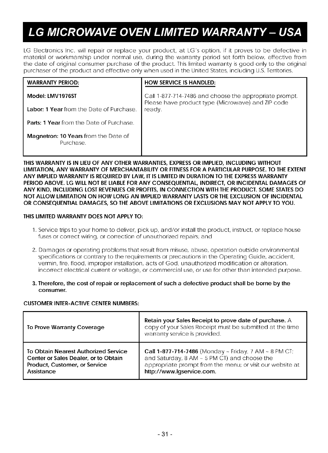 LG Electronics Inc. will repair or replace your product, at LG's option, if it proves to be defective in