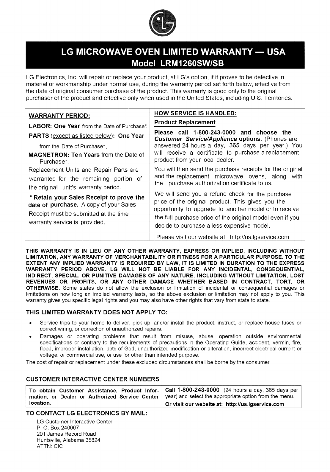 User Manual: LG LRM1260SW LRM1260SW LG MICROWAVE OVEN - Manuals and Guides View the owners manual for your LG MICROWAVE OVEN #LRM1260SW. Home:Kitchen Appliance Parts:LG Parts:LG MICROWAVE OVEN Manual