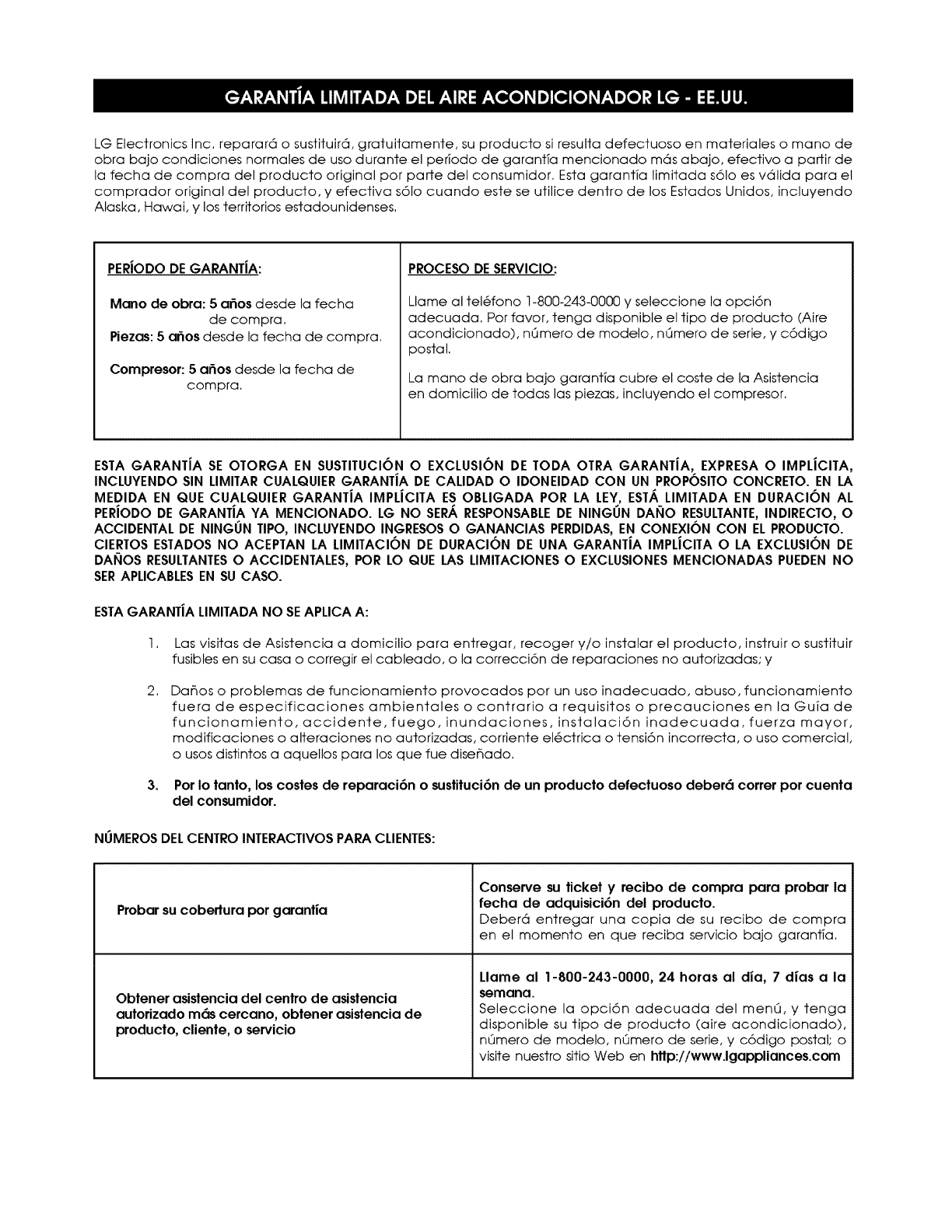 PERiODO DE GARANTiA YA MENCIONADO. LG NO SERA.RESPONSABLEDE NINGUN DANO RESULTANTE,INDIRECTO, O